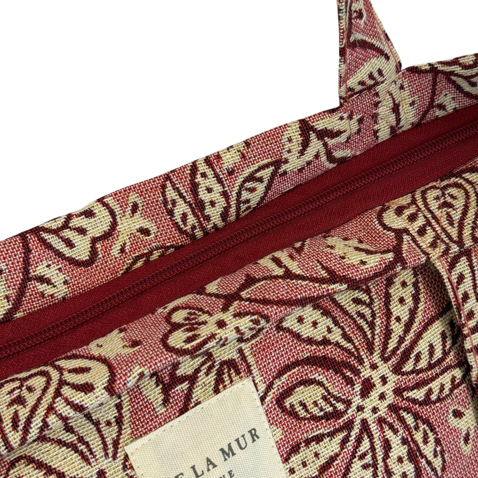 Deze grote shopper van De La Mur Line is uitgevoerd in jacquardstof met een verfijnd bloemmotief in crèmekleur op een oudroze achtergrond.