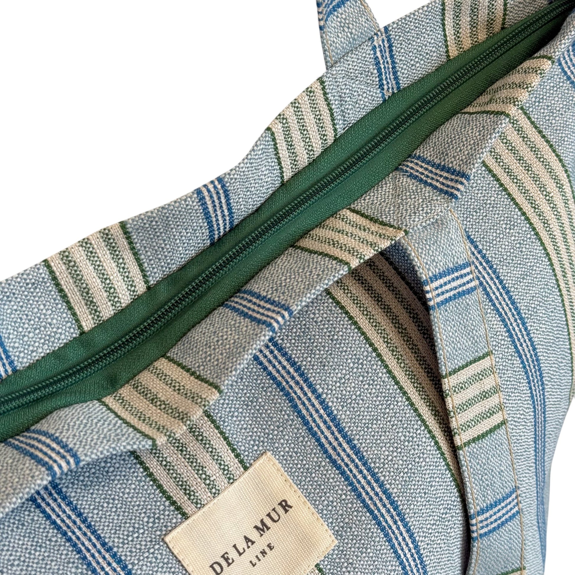 Deze grote shopper van De La Mur Line is uitgevoerd in jacquardstof met een verticaal streeppatroon in blauw- en groentinten.