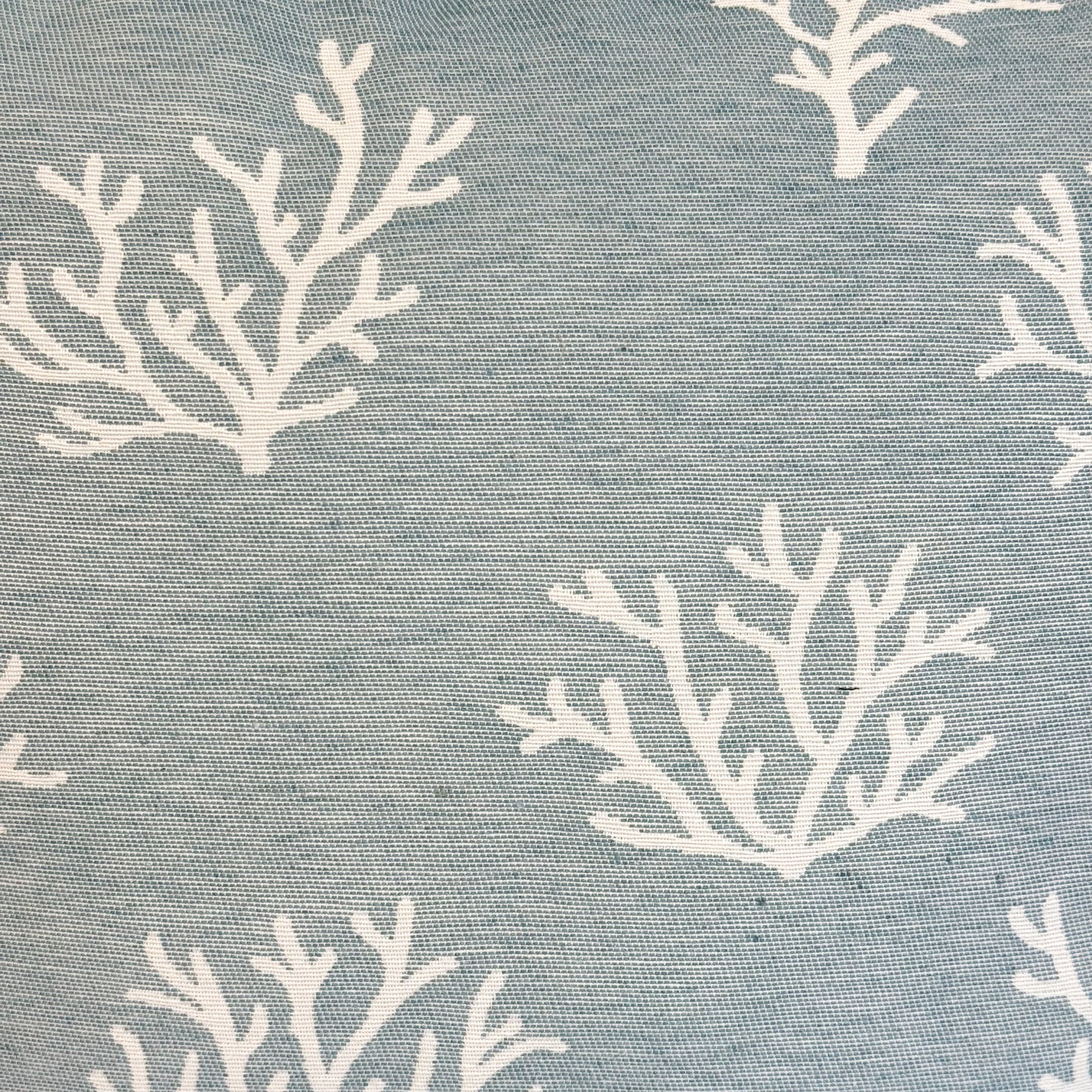 Deze grote shopper van De La Mur Line is uitgevoerd in jacquardstof met een speels koraalachtig motief in crèmekleur op een zachte blauwgroene achtergrond.