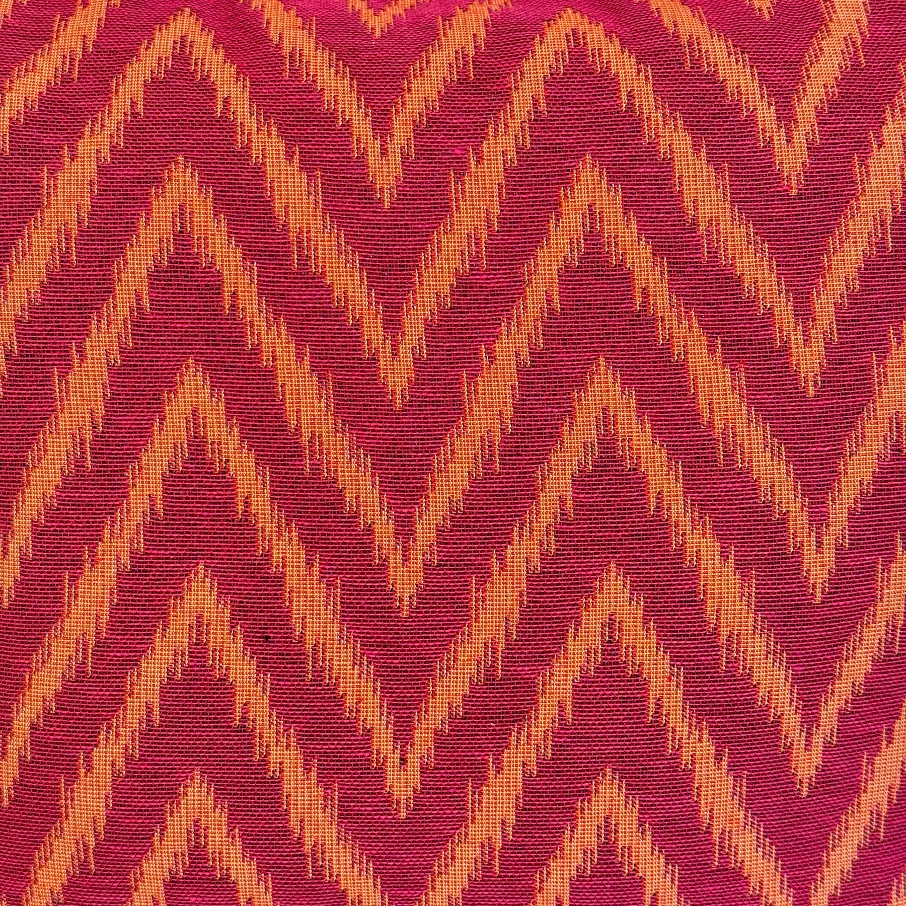 Deze grote shopper van De La Mur Line is uitgevoerd in jacquardstof met een zigzagpatroon in bordeaux- en oranjetinten.