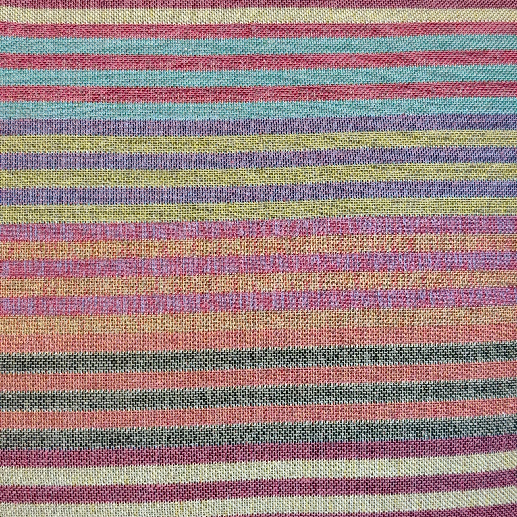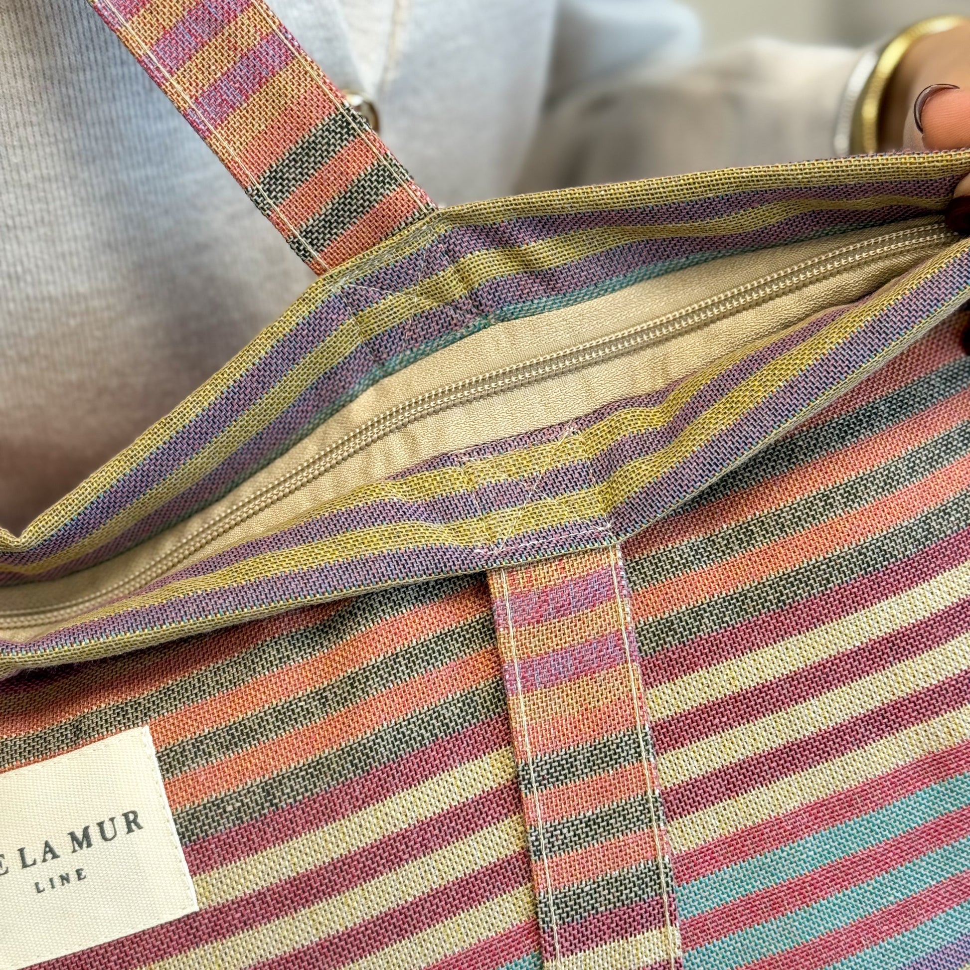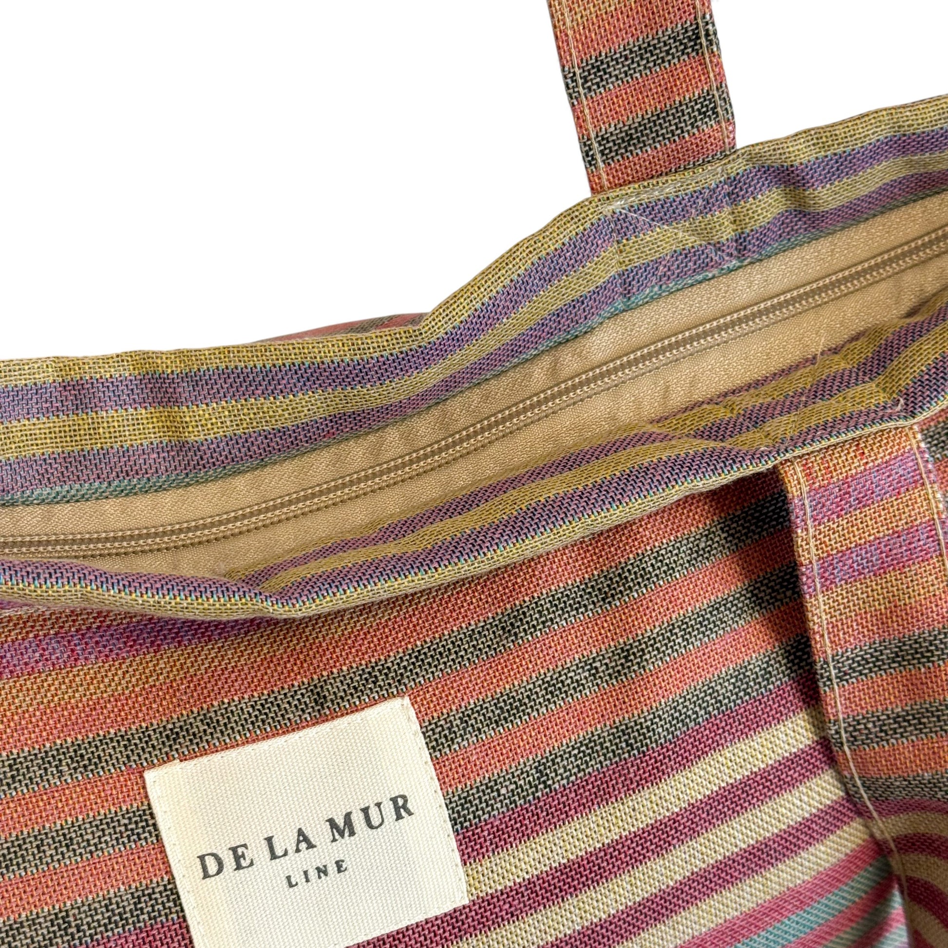 Deze grote shopper van De La Mur Line is uitgevoerd in jacquardstof met een meerkleurig streeppatroon in zachte roze-, lila en oranjetinten.