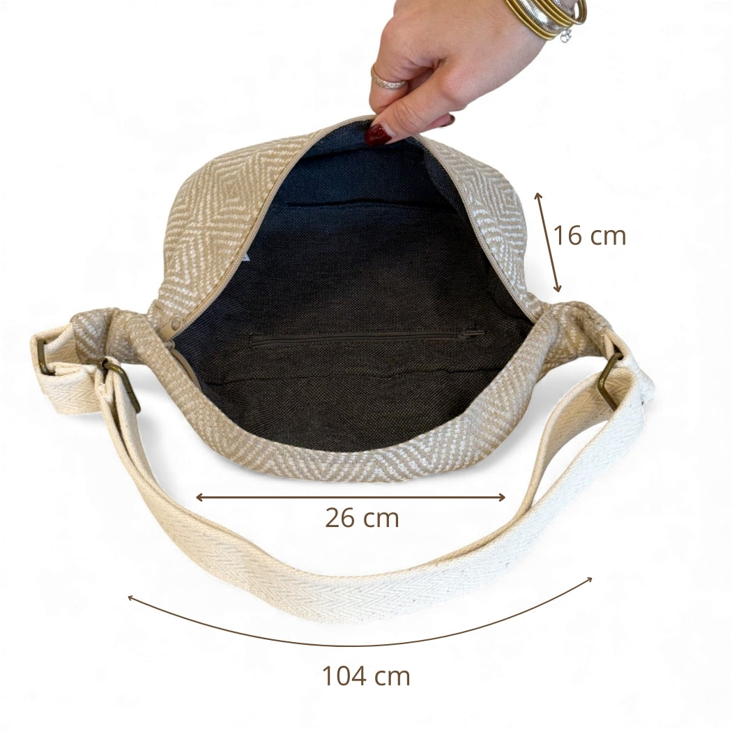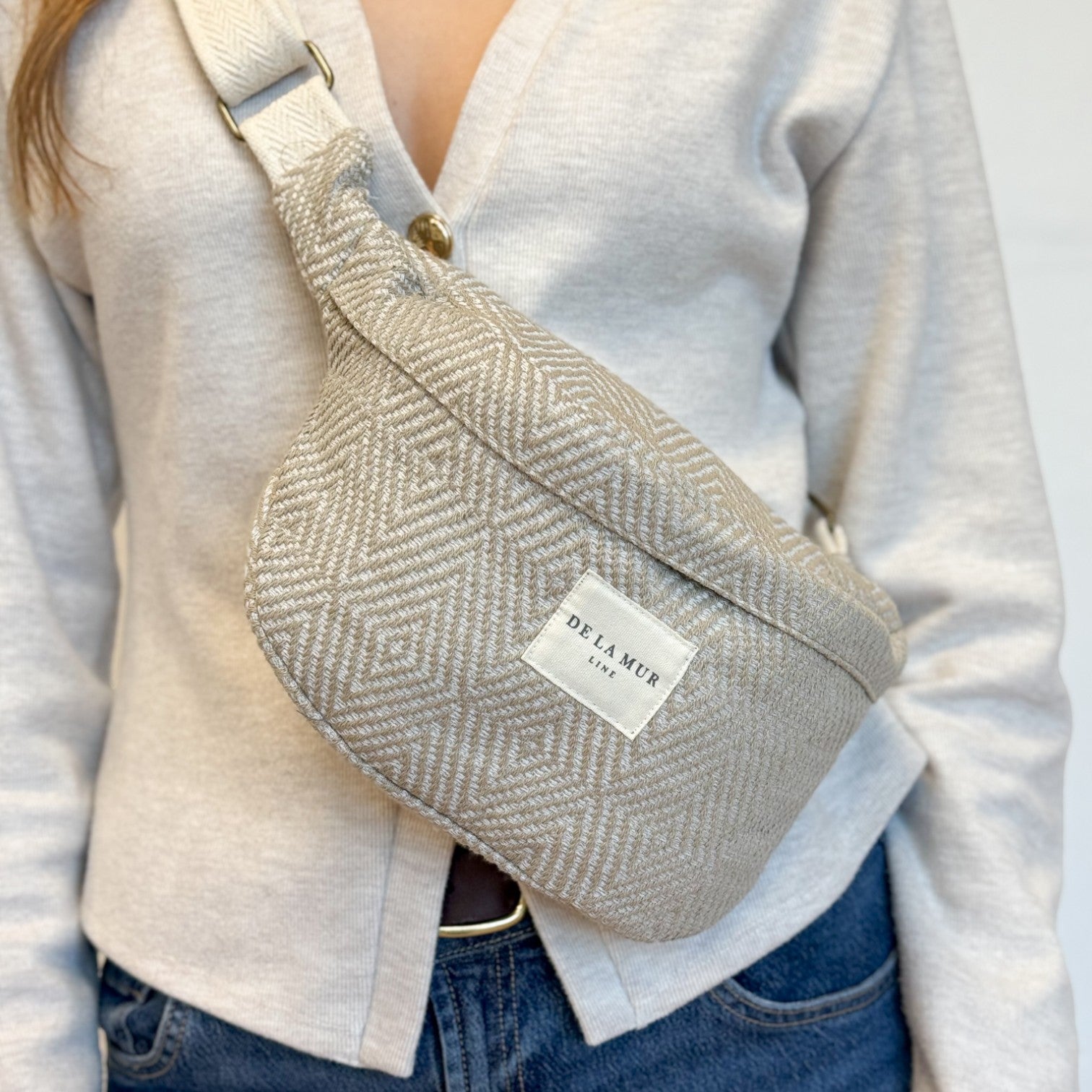 Dé musthave in je tassencollectie: de heuptas! Dit hippe heuptasje van de La Mur Line, ook wel fanny pack genoemd, is uitgevoerd in zandkleurige jacquarstof met een subtiele geometrische print in natuurlijke tinten.