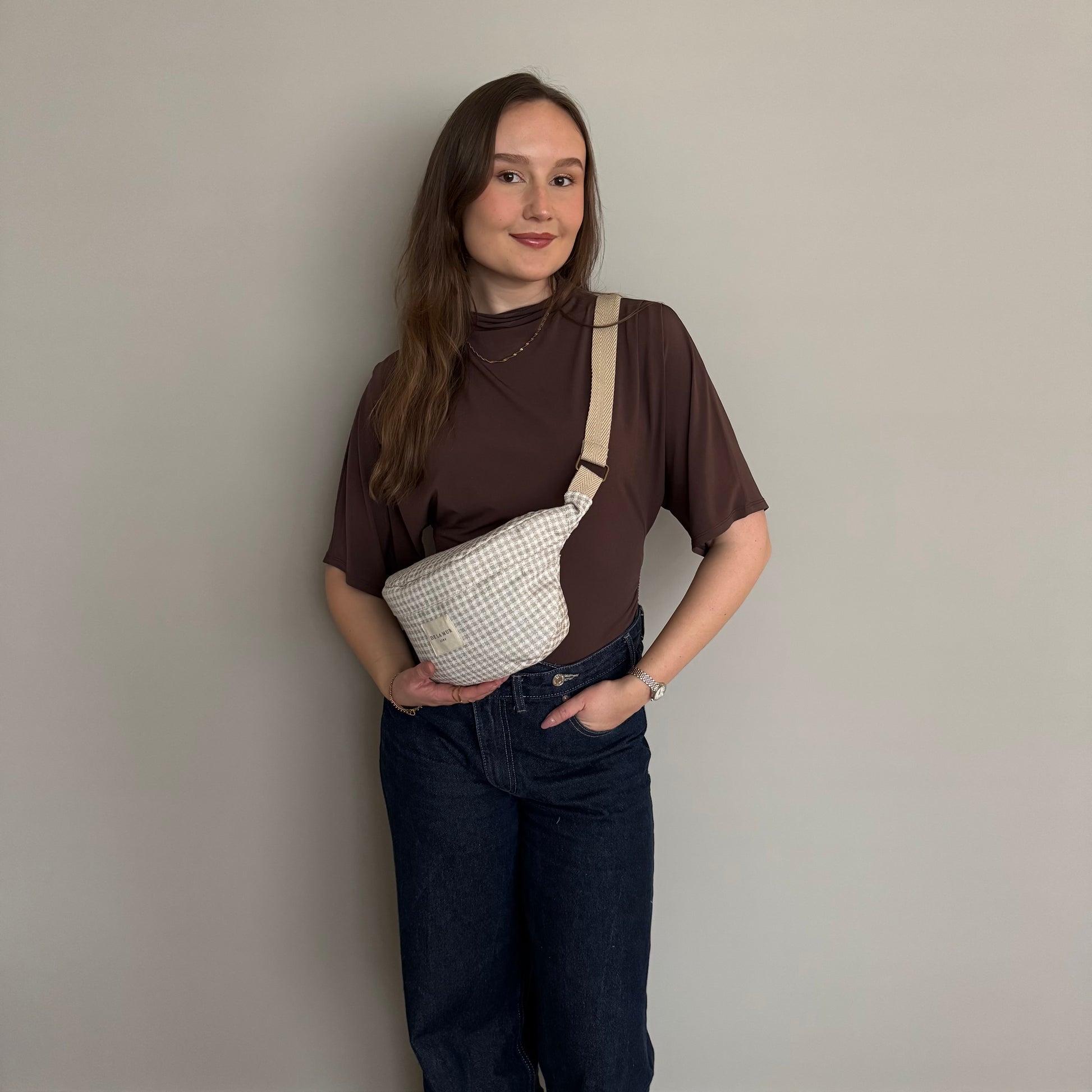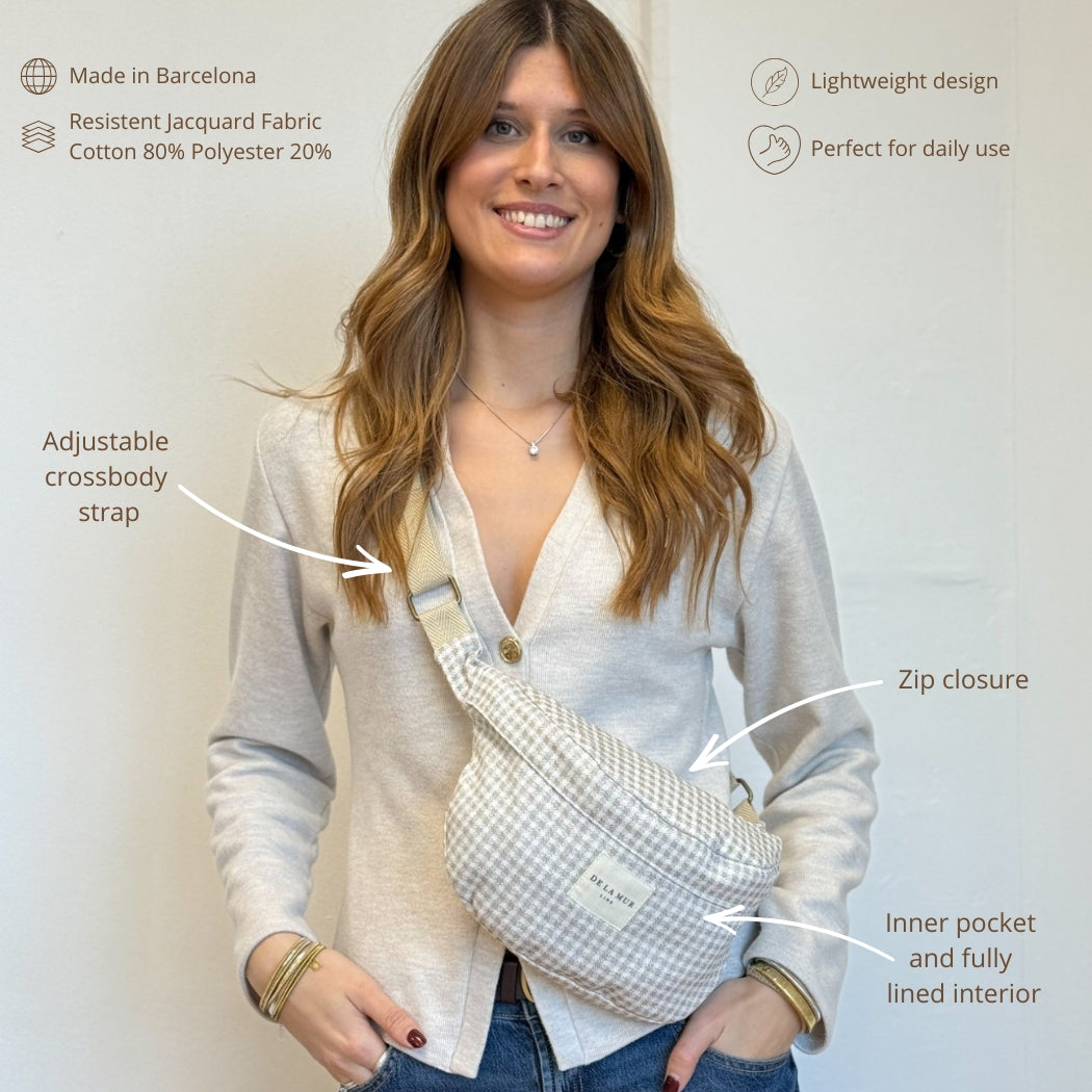 Dé musthave in je tassencollectie: de heuptas! Dit hippe heuptasje van de La Mur Line, ook wel fanny pack genoemd, is uitgevoerd in jacquardstof met een vichy-ruitpatroon in beige- en crèmetinten.