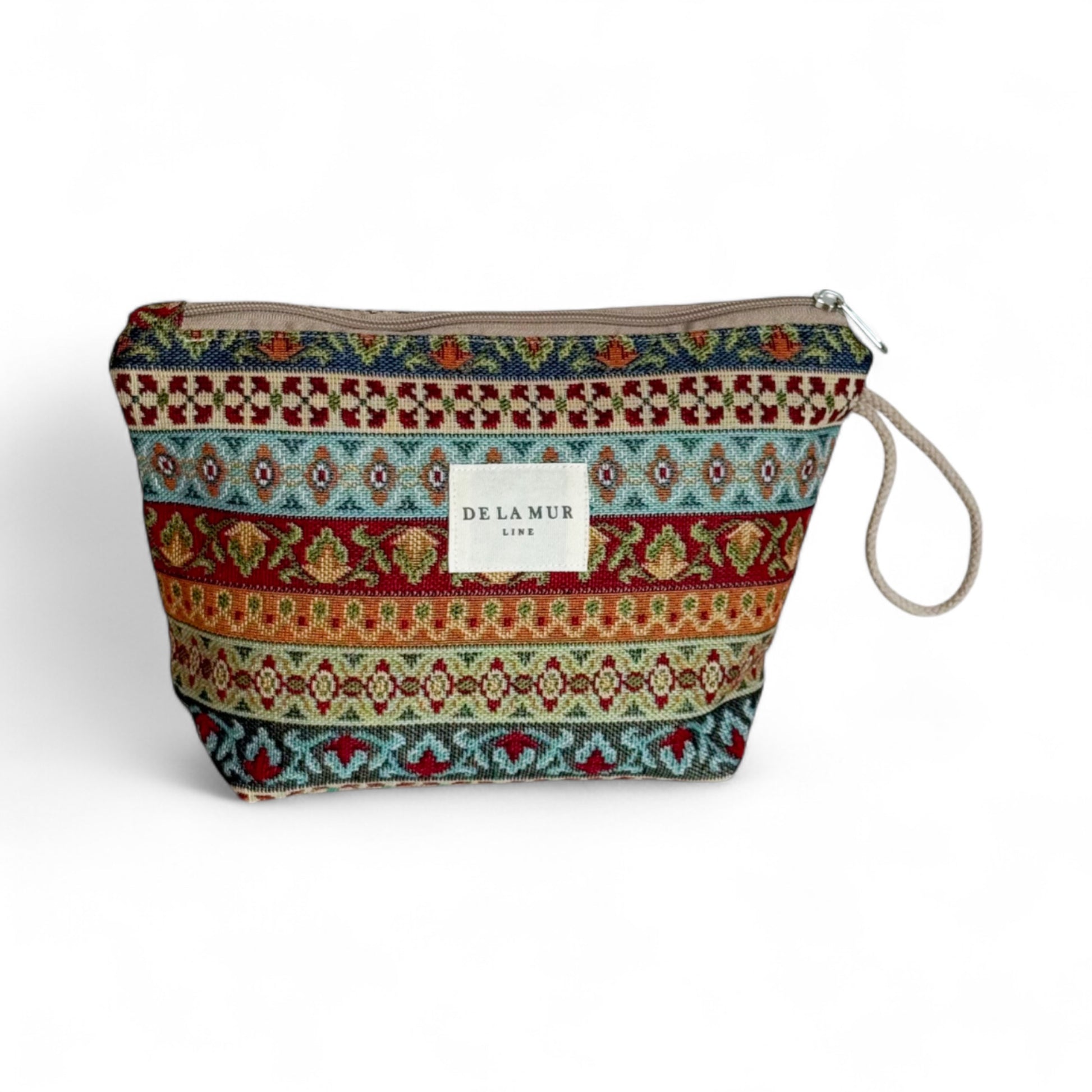 Deze Beauty Bag van de La Mur Line, ook wel toilettas of make-up tas genoemd, is uitgevoerd in een dikke jacquardstof met een kleurrijk streeppatroon van geometrische en florale motieven. Warme tinten zoals roest, turquoise, oker en crème wisselen elkaar af. Elk item kan variëren in patroon, afhankelijk van hoe het is uitgesneden.