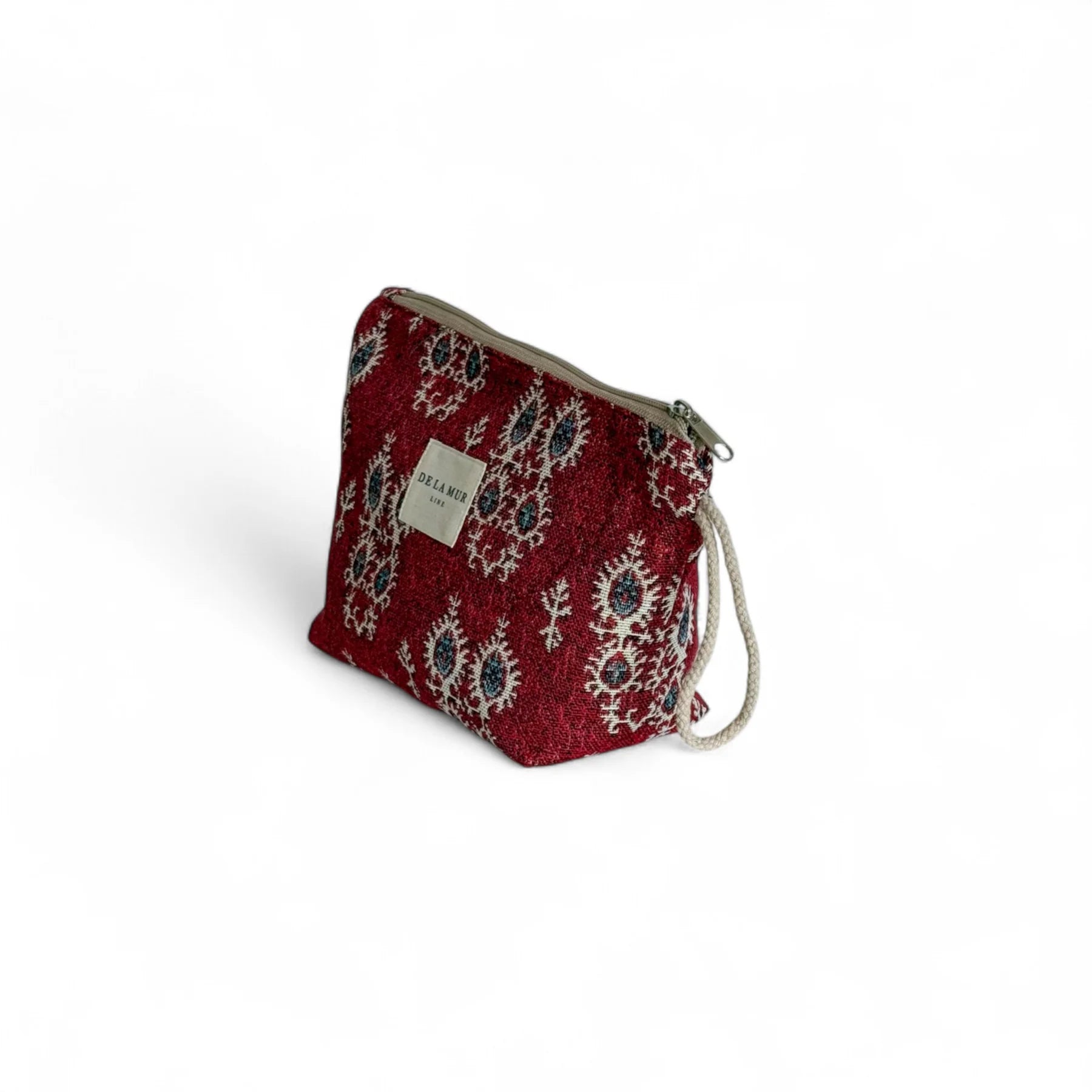 Deze Beauty Bag van de La Mur Line, ook wel toilettas of make-up tas genoemd, is uitgevoerd in een dikke jacquardstof met een klassiek patroon op een wijnrode achtergrond. Elk item kan variëren in patroon, afhankelijk van hoe het is uitgesneden.