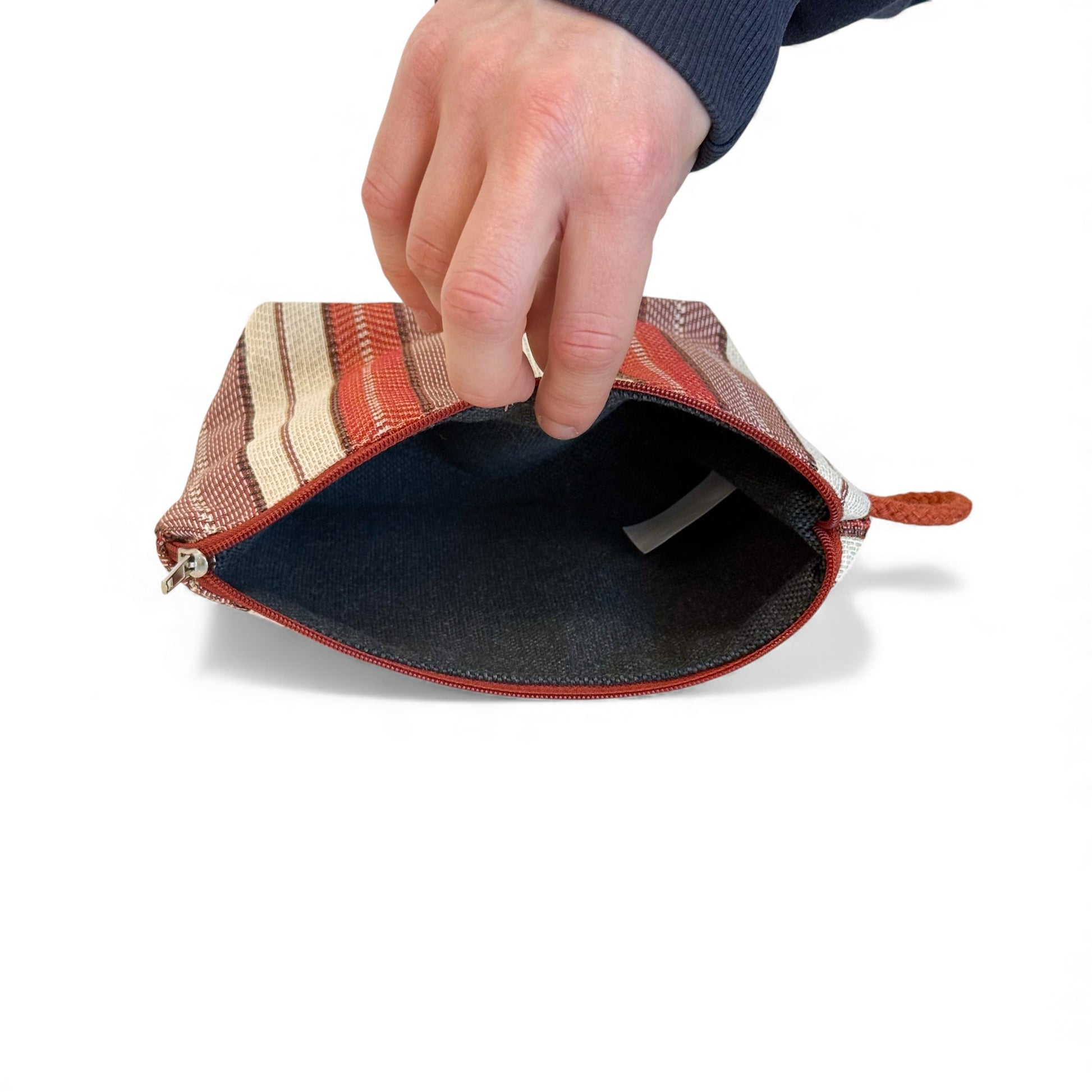 Deze Beauty Bag van de La Mur Line, ook wel toilettas of make-up tas genoemd, is uitgevoerd in jacquardstof met een verticaal streeppatroon in warme rood-, bordeaux- en off-white tinten. Elk item kan variëren in patroon, afhankelijk van hoe het is uitgesneden.