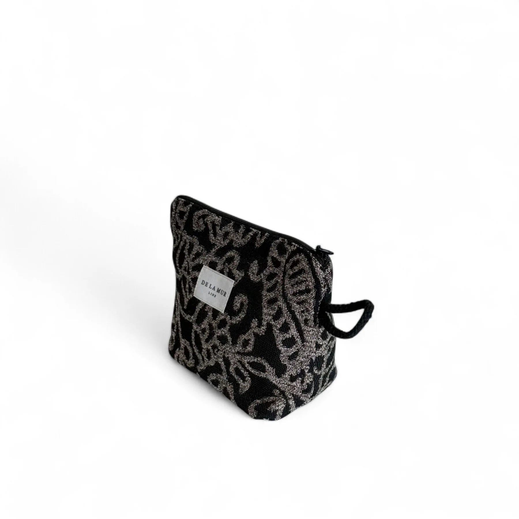 Deze Beauty Bag van de La Mur Line, ook wel toilettas of make-up tas genoemd, is uitgevoerd in een dikke jacquardstof met een sierlijk, grijs paisleypatroon op een diepzwarte achtergrond. Elk item kan variëren in patroon, afhankelijk van hoe het is uitgesneden.
