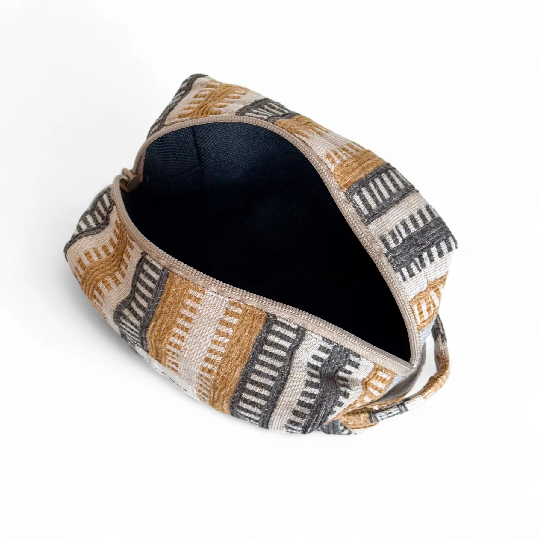 Deze Beauty Bag van de La Mur Line, ook wel toilettas of make-up tas genoemd, is uitgevoerd in een dikke jacquardstof met een streeppatroon in mosterdgeel, zwart, wit en grijs. Elk item kan variëren in patroon, afhankelijk van hoe het is uitgesneden.
