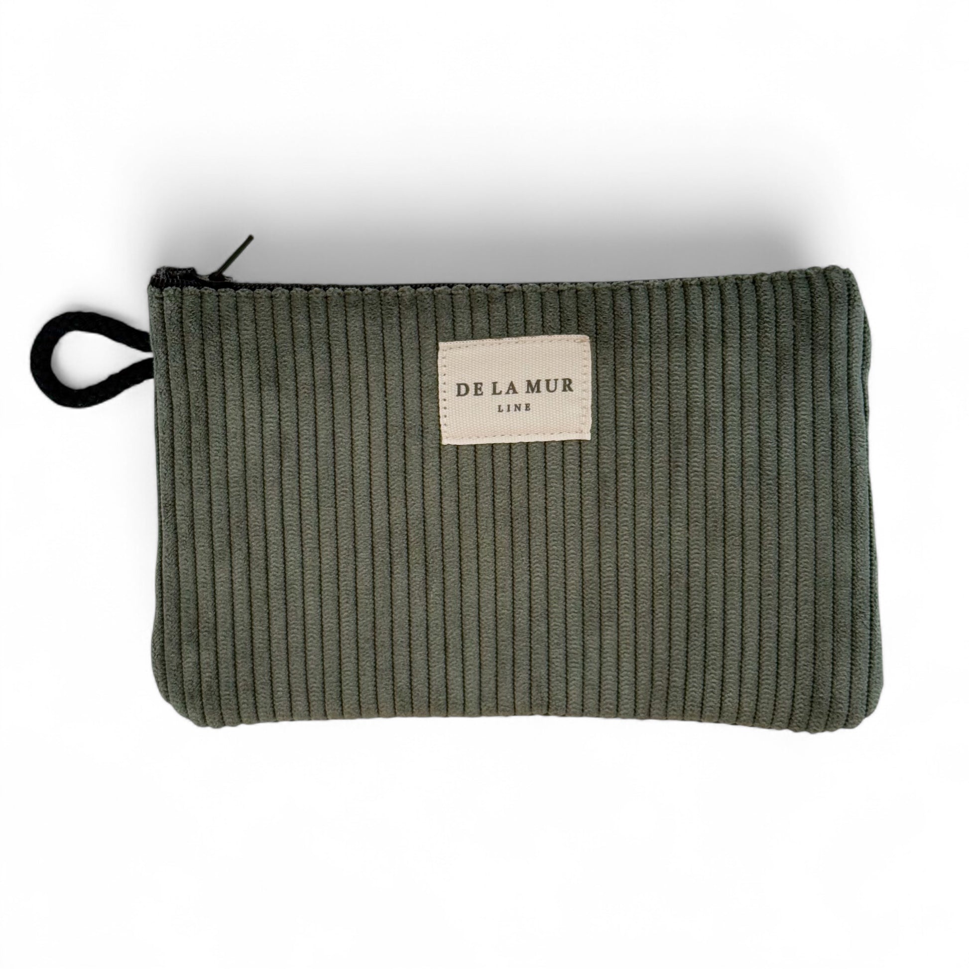 Dit leuke en compacte make up tasje van de La Mur Line is uitgevoerd in een donkergroene corduroy ribstof.
