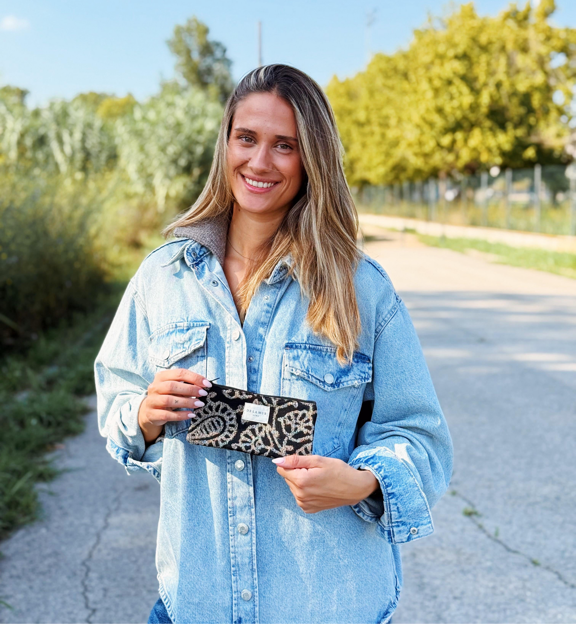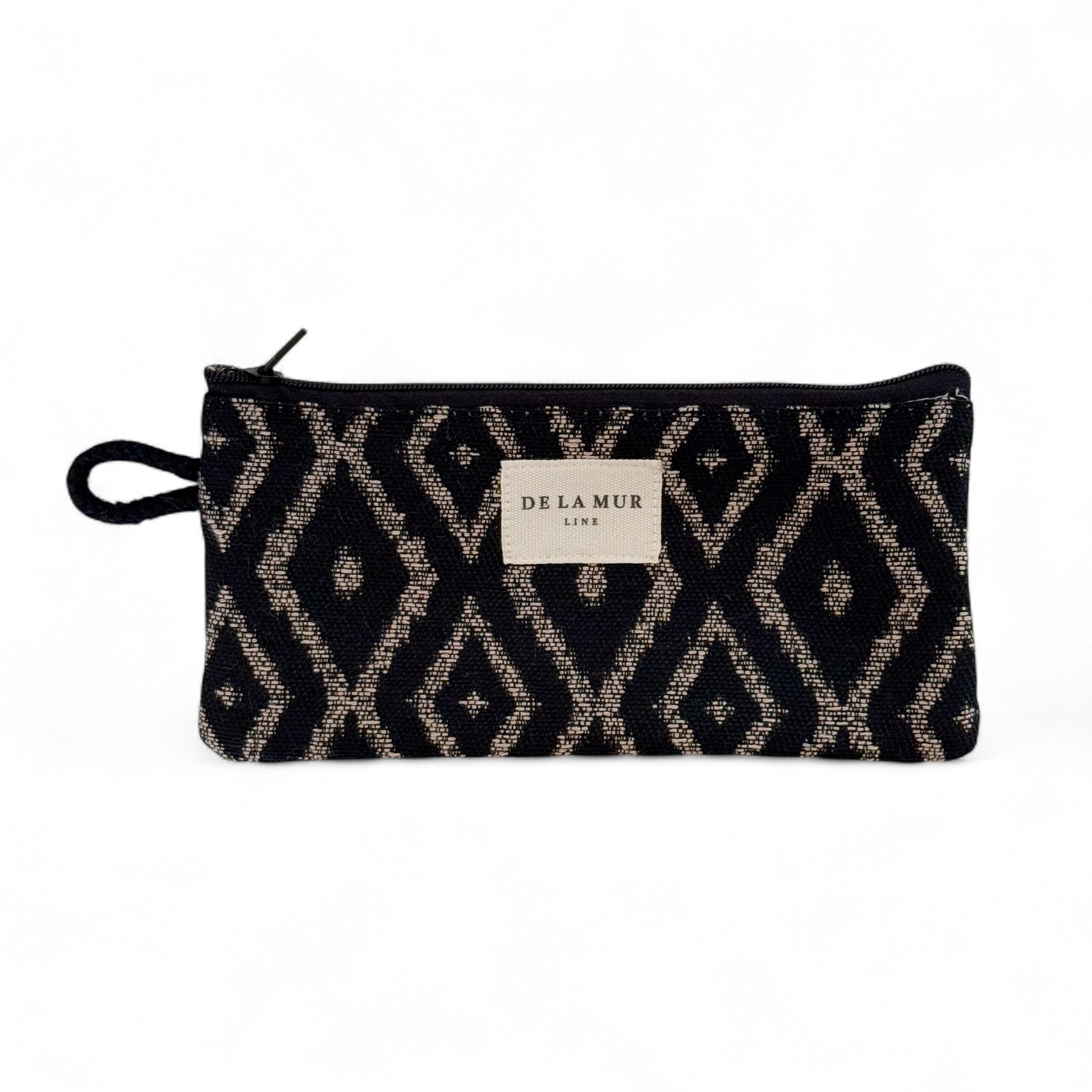 Dit leuke brillentasje van de La Mur Line, ook wel brillenetui of brillenhoesje genoemd, is uitgevoerd in een dikke jacquardstof met een beige, grafisch ruitpatroon op een diepzwarte achtergrond. Elk item kan variëren in patroon, afhankelijk van hoe het is uitgesneden.