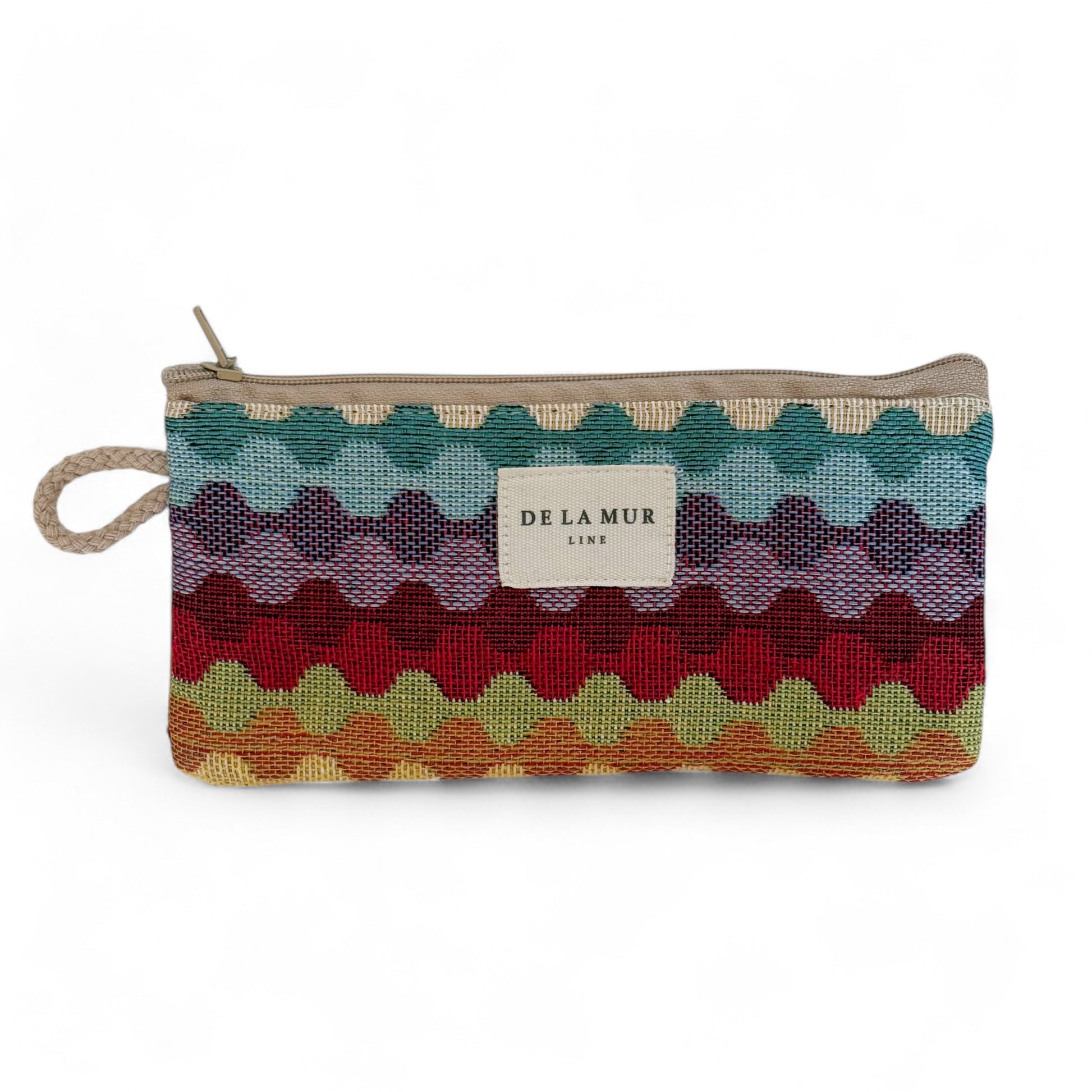 Dit leuke brillentasje van de La Mur Line, ook wel brillenetui of brillenhoesje genoemd, is uitgevoerd in een dikke jacquardstof met een ritmisch, golvend patroon in kleurrijke banen. Warme tinten zoals roest, oker, turquoise en aubergine wisselen elkaar speels af. Elk item kan variëren in patroon, afhankelijk van hoe het is uitgesneden.