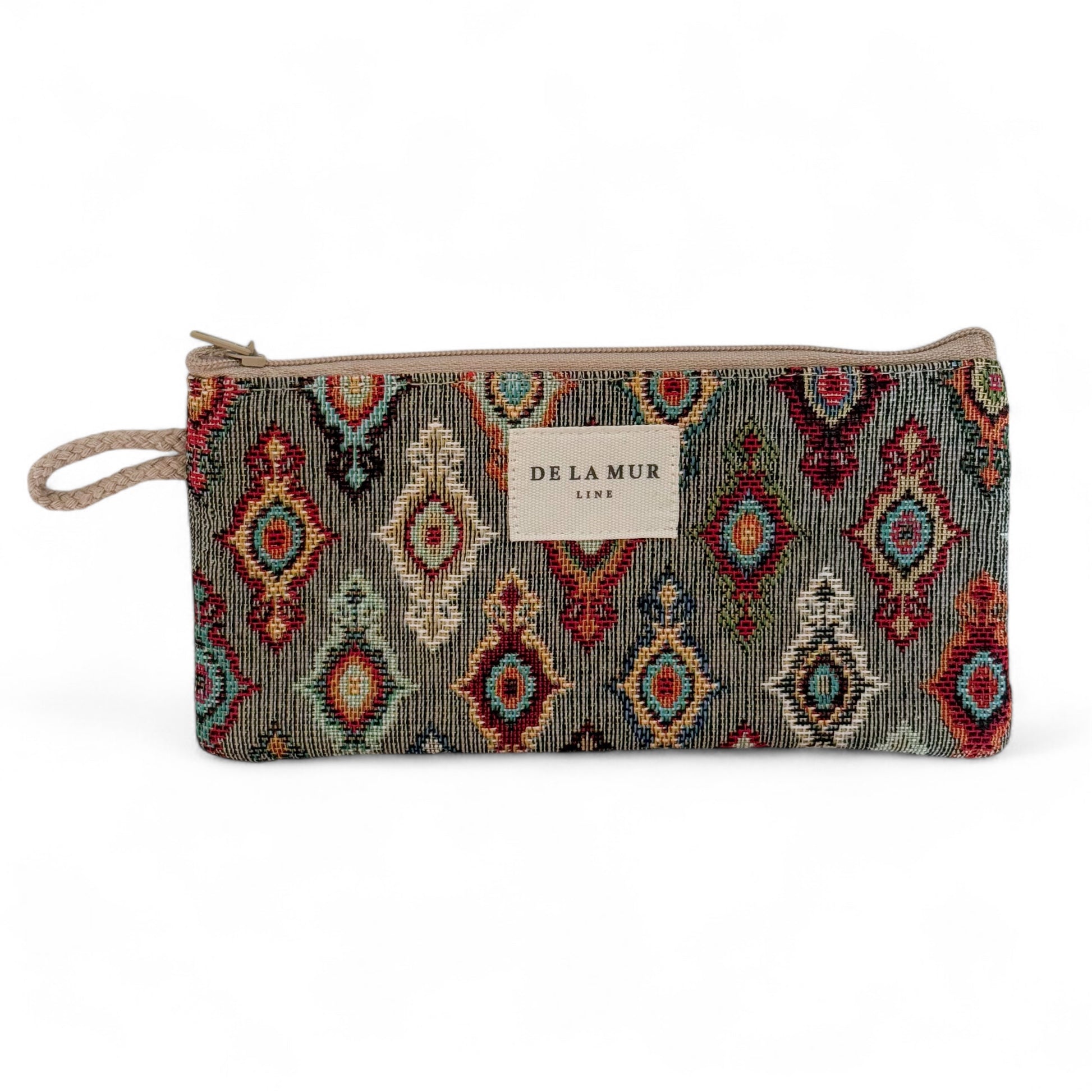 Dit leuke brillentasje van de La Mur Line, ook wel brillenetui of brillenhoesje genoemd, is uitgevoerd in een dikke jacquardstof met een ruitmotief in warme tinten zoals grijs, roest, donkergroen, oker en turquoise. Elk item kan variëren in patroon, afhankelijk van hoe het is uitgesneden.