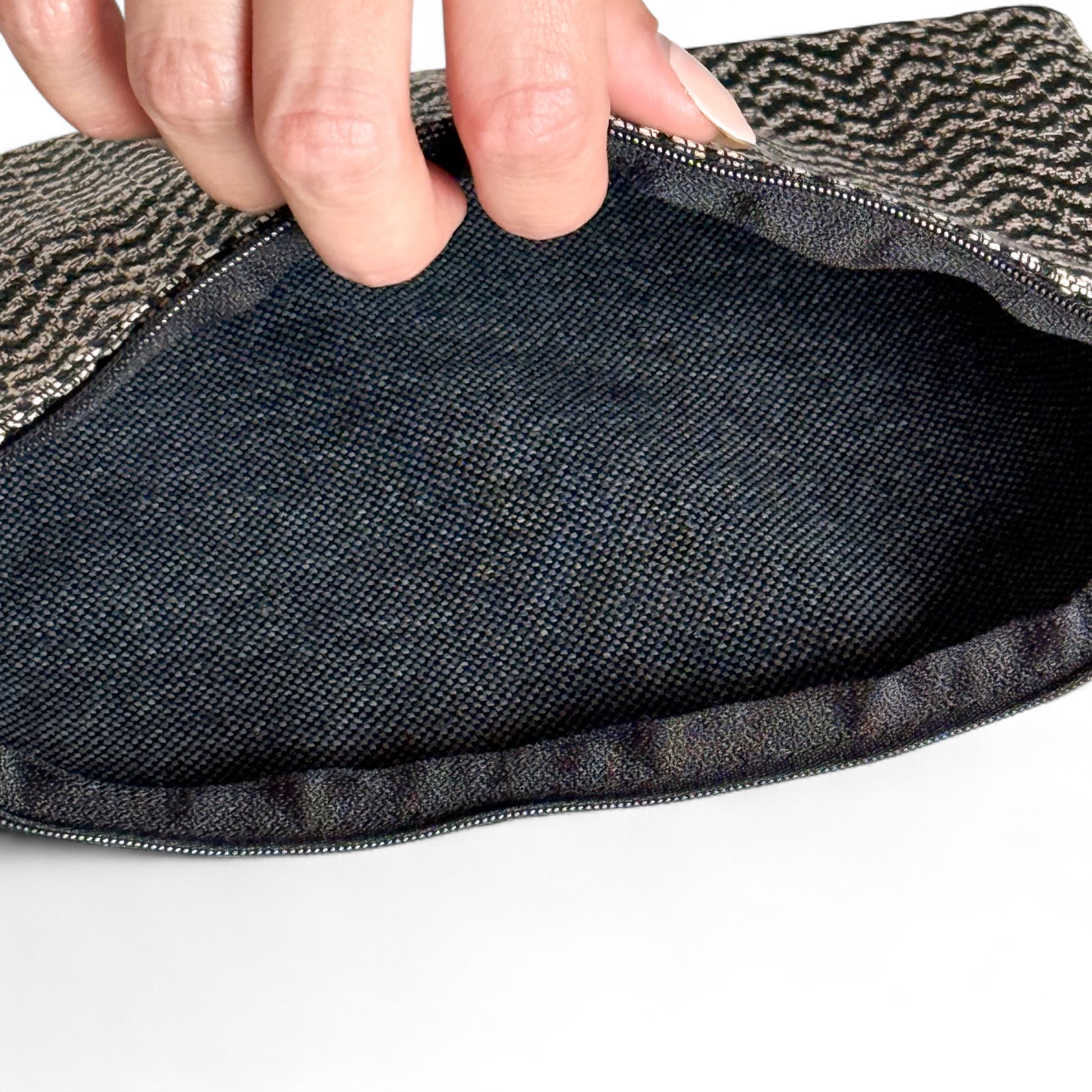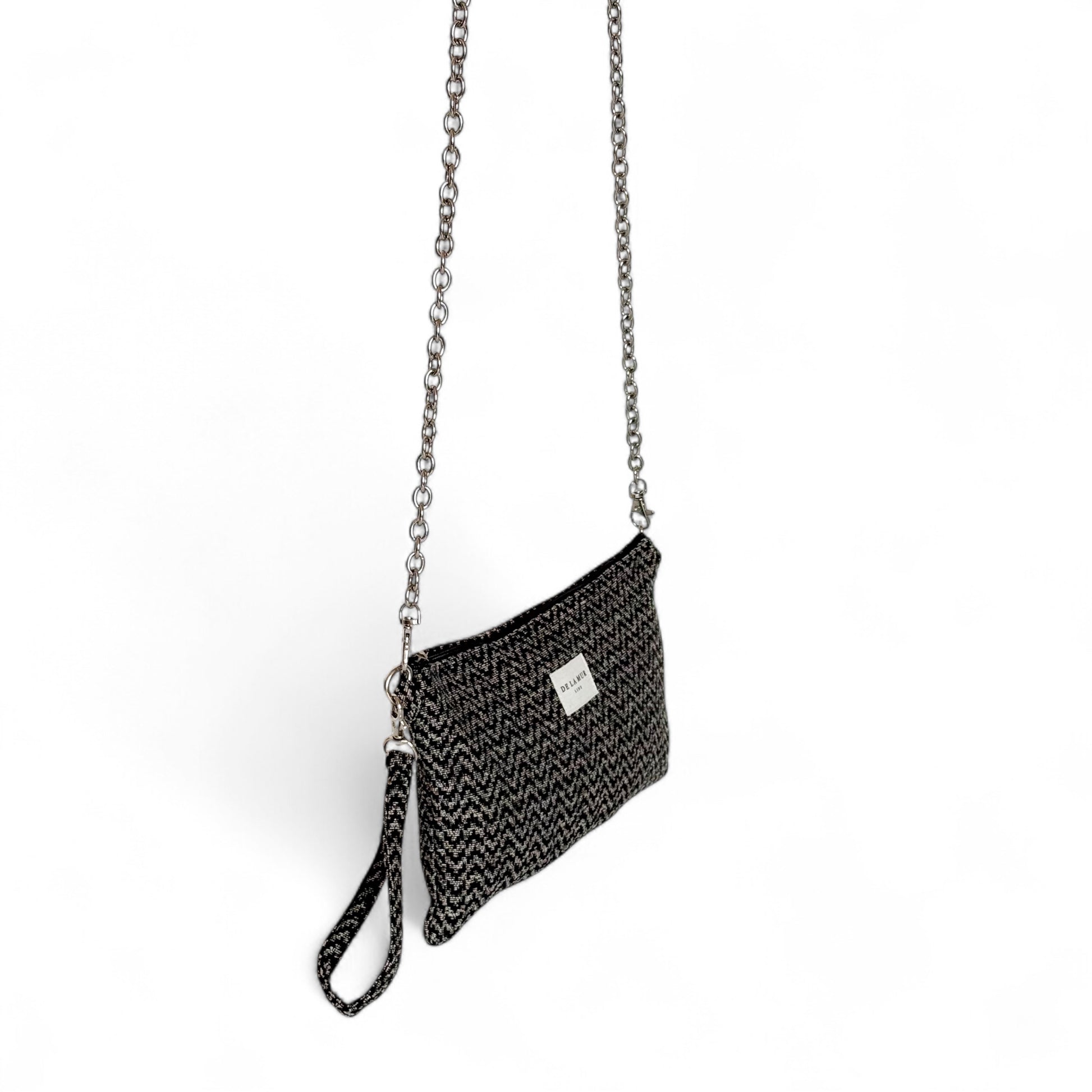 Dit charmante handtasje van de La Mur Line, ook wel avondtasje genoemd, is uitgevoerd in een dikke jacquardstof met een zigzagpatroon in zwart en beige.