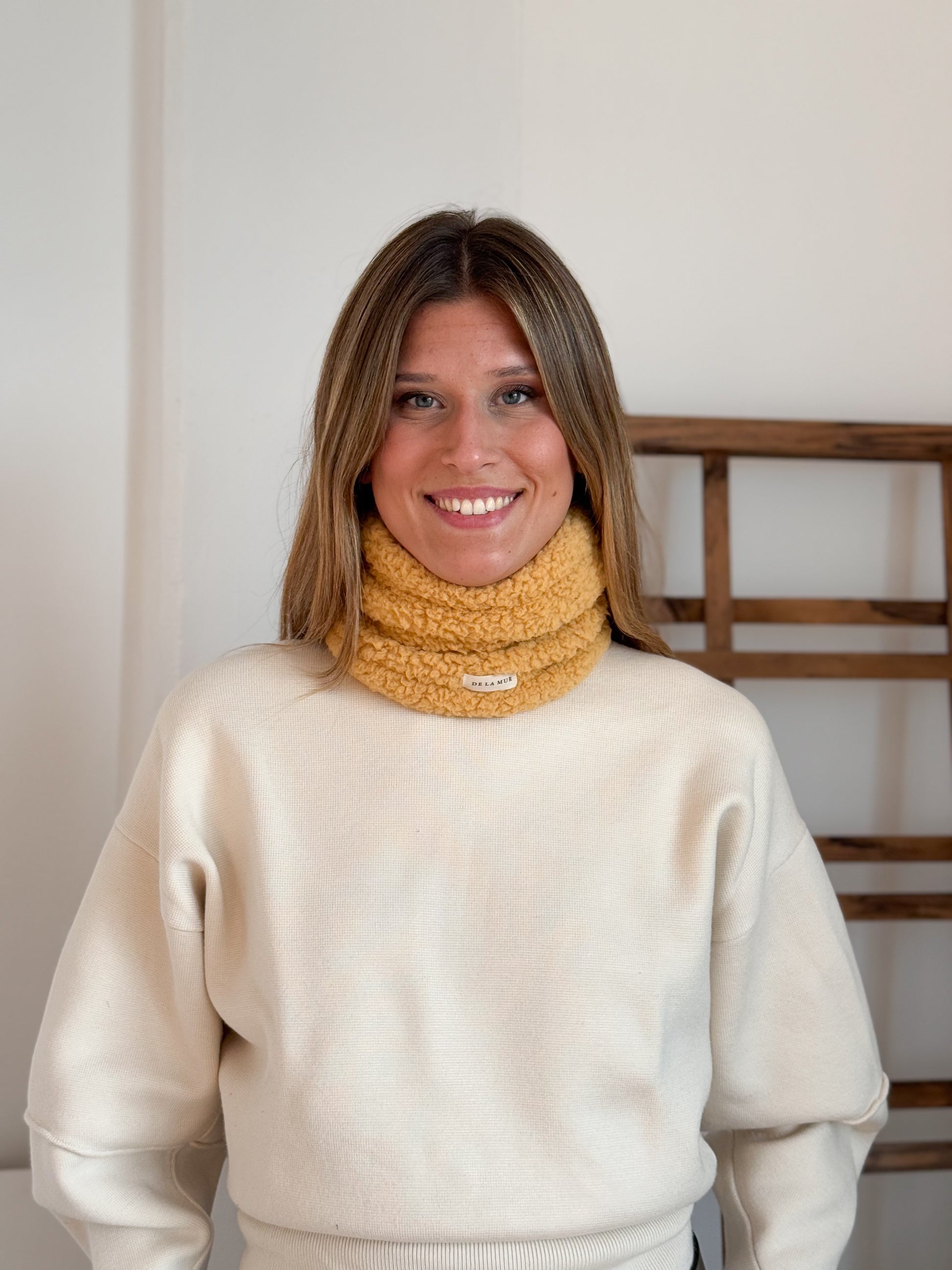 Deze colsjaal van de La Mur Line is uitgevoerd in een mosterdgele teddystof.