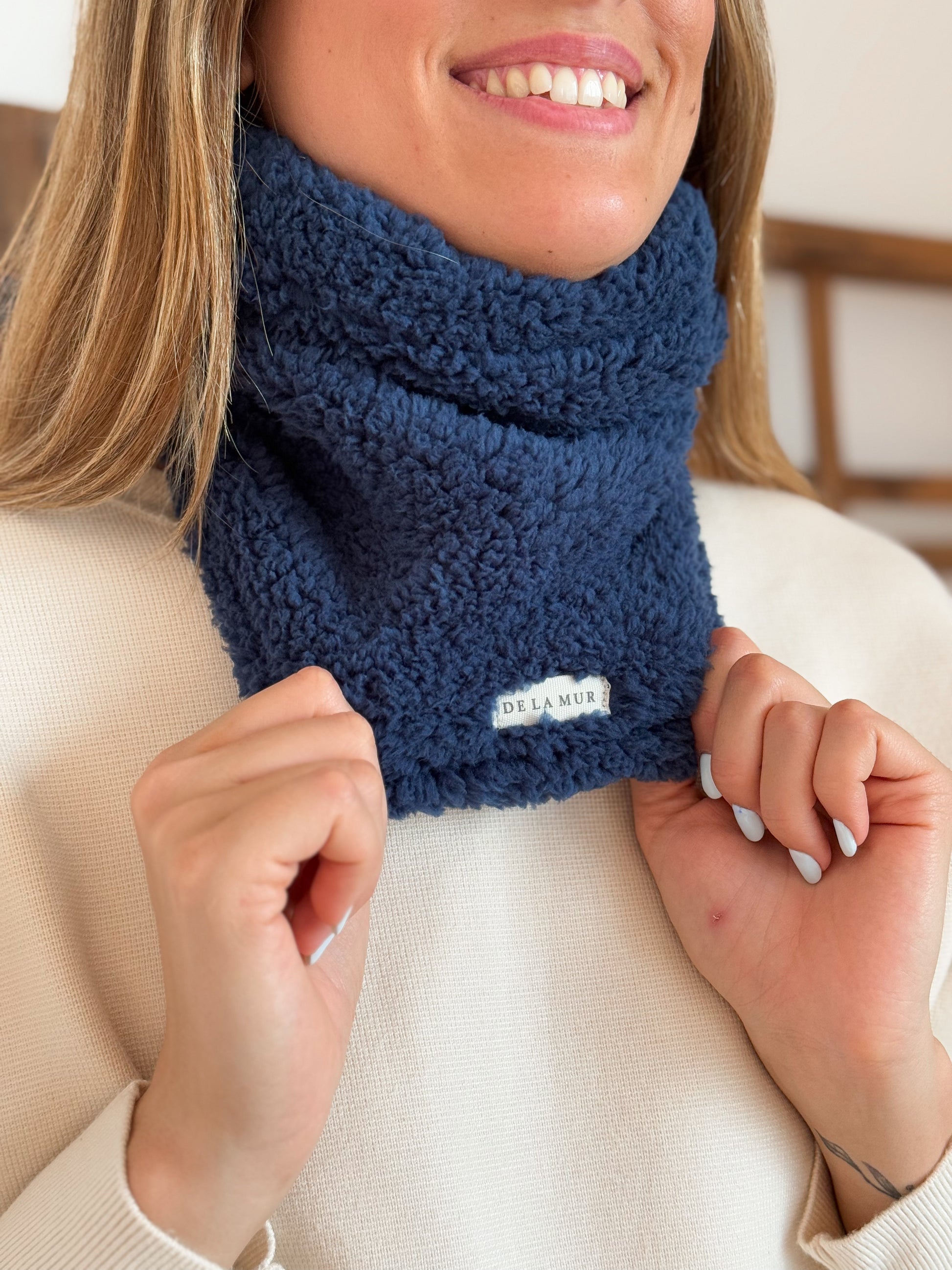 Deze colsjaal van de La Mur Line is uitgevoerd in een marineblauwe teddystof.