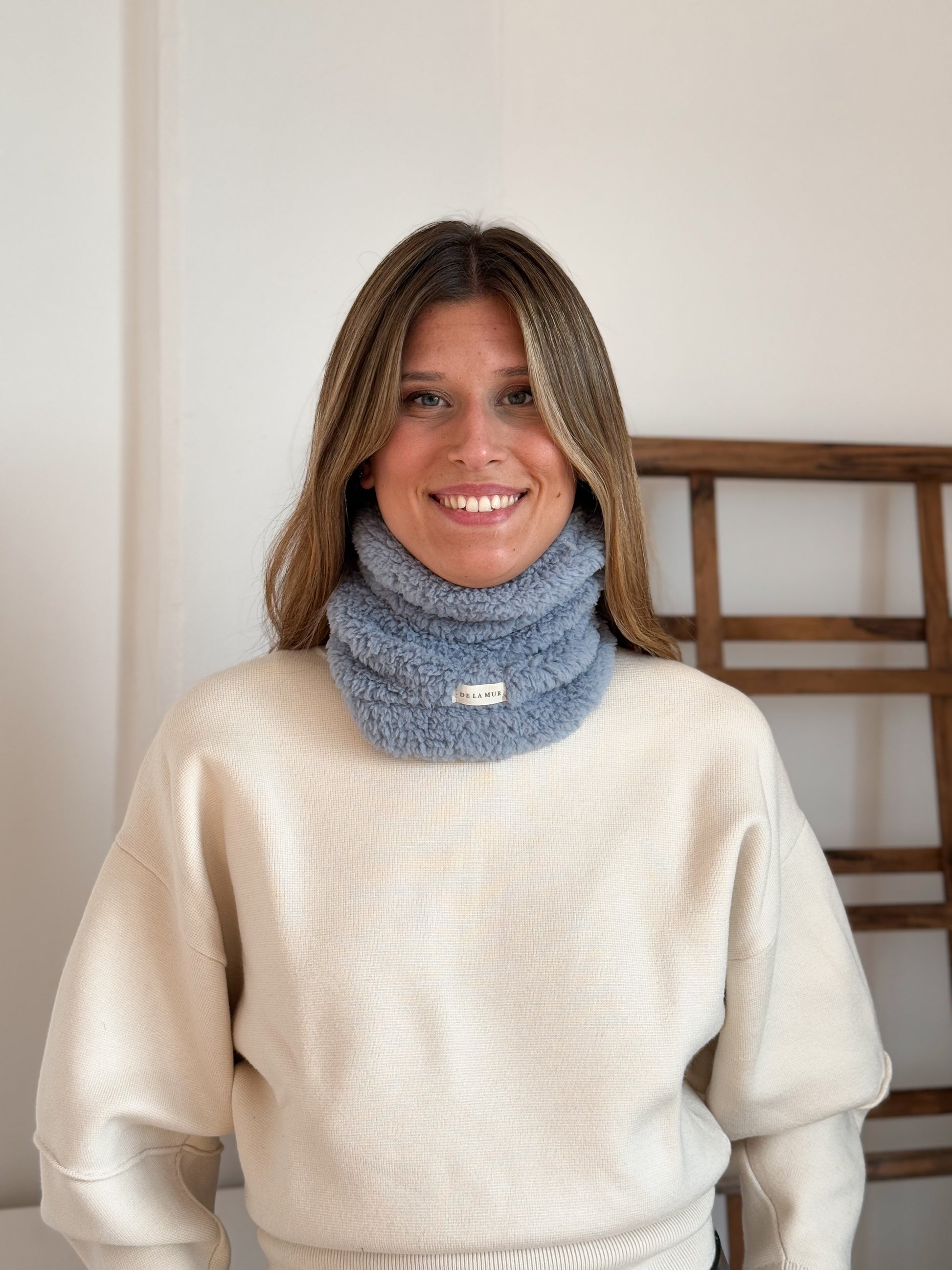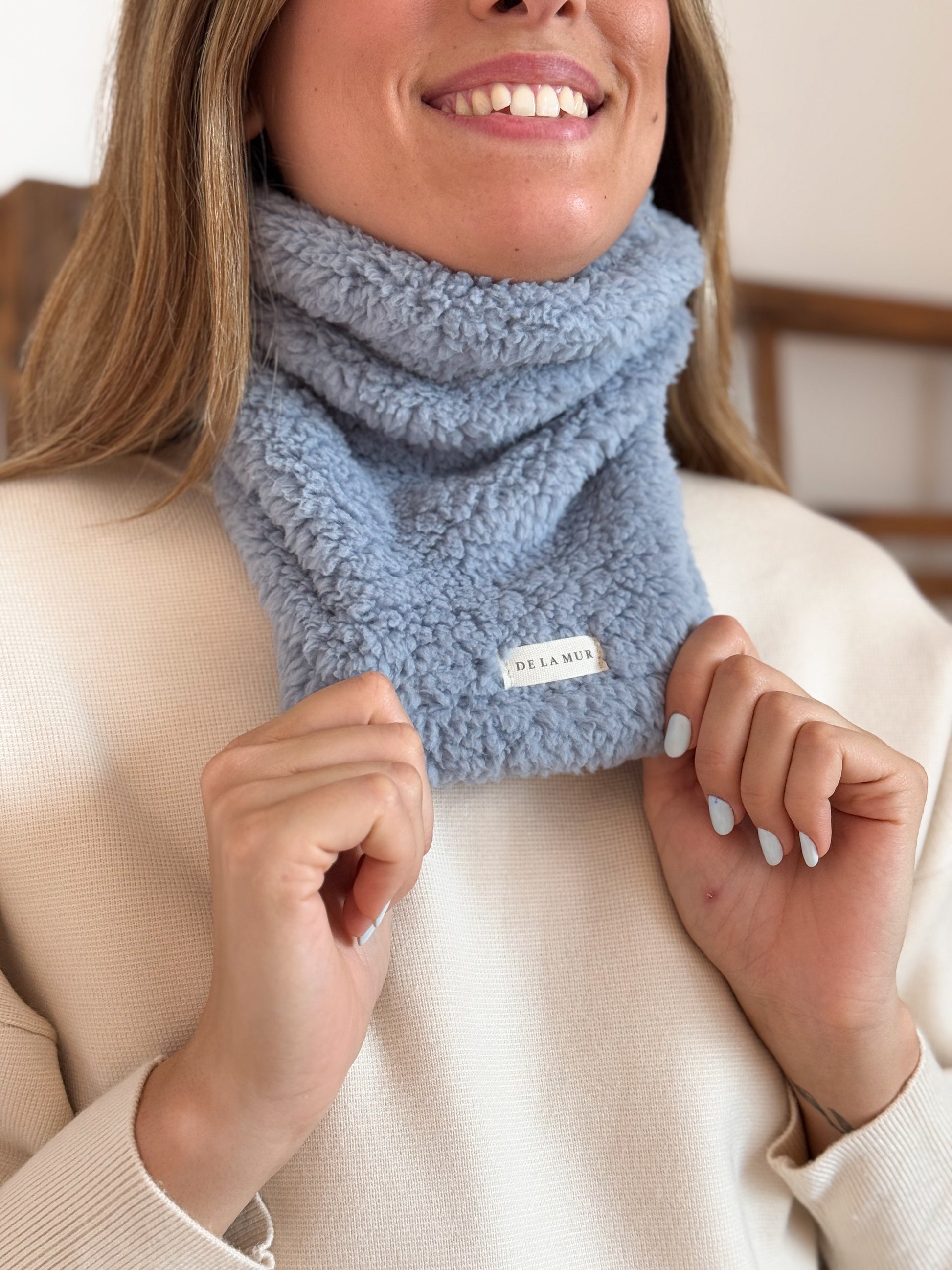 Deze colsjaal van de La Mur Line is uitgevoerd in een lichtblauweblauwe teddystof.