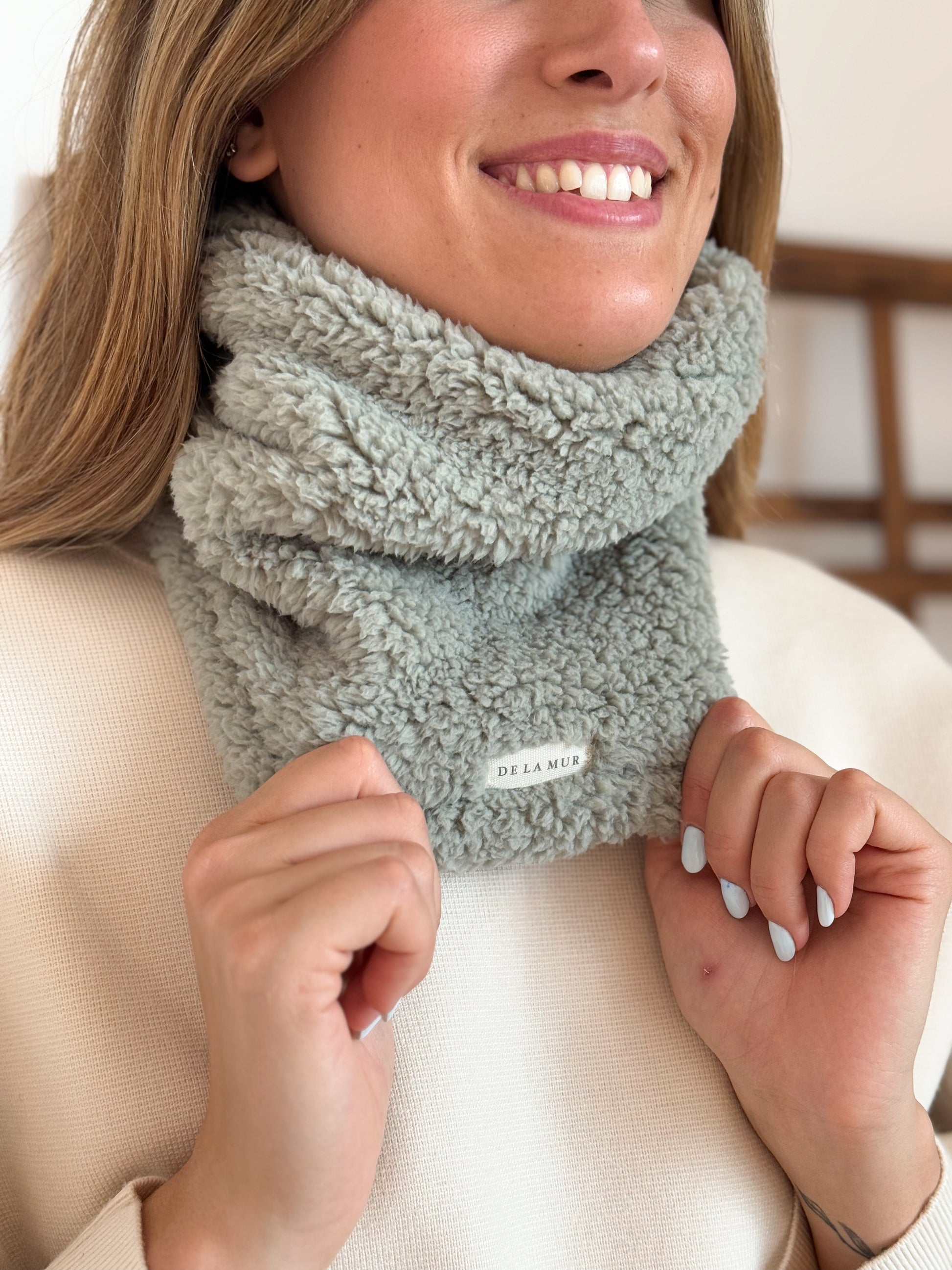 Deze colsjaal van de La Mur Line is uitgevoerd in een lichtgroene teddystof.
