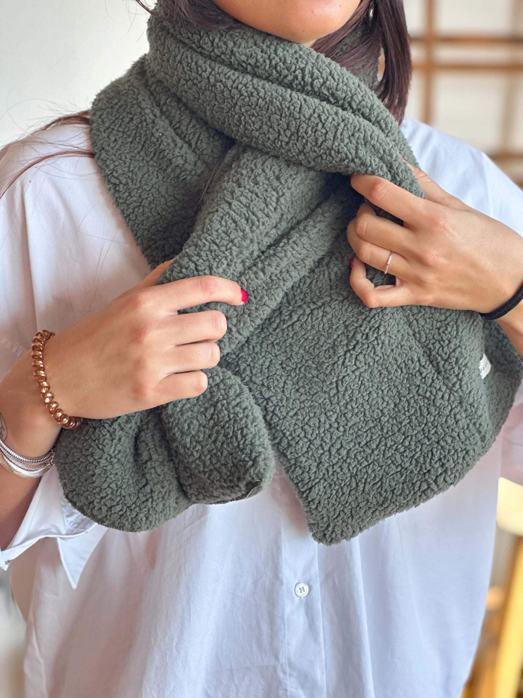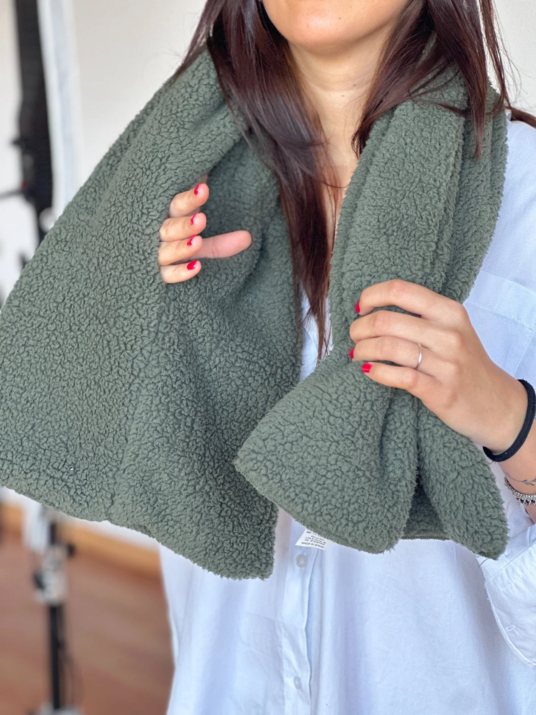 Deze doorsteeksjaal van de La Mur Line is uitgevoerd in een kakigroene teddystof.