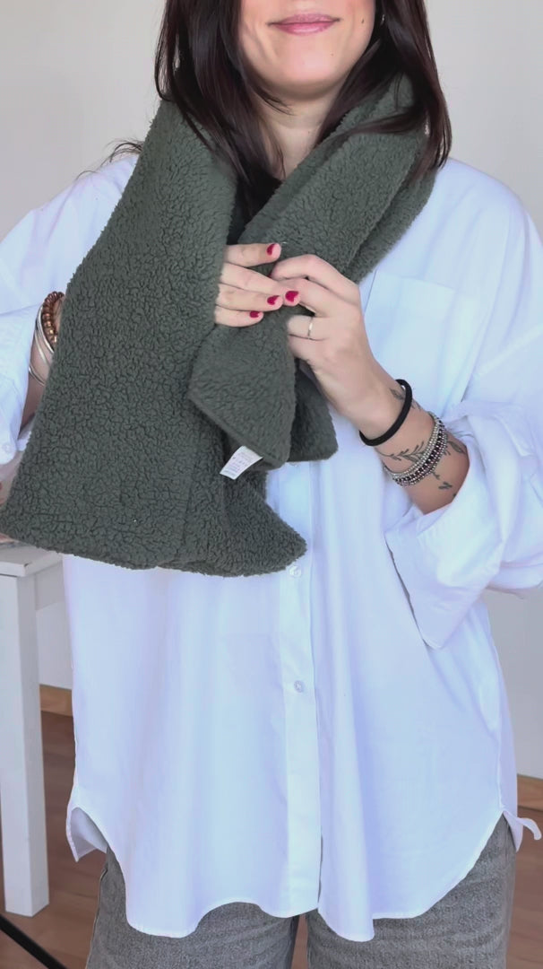 Dankzij het handige ontwerp steek je het uiteinde eenvoudig door de opening waardoor de sjaal mooi op zijn plaats blijft zitten. Deze korte teddy sjaal is compact, zacht en warm - een elegante winteraccesoire die comfort en stijl perfect combineert.