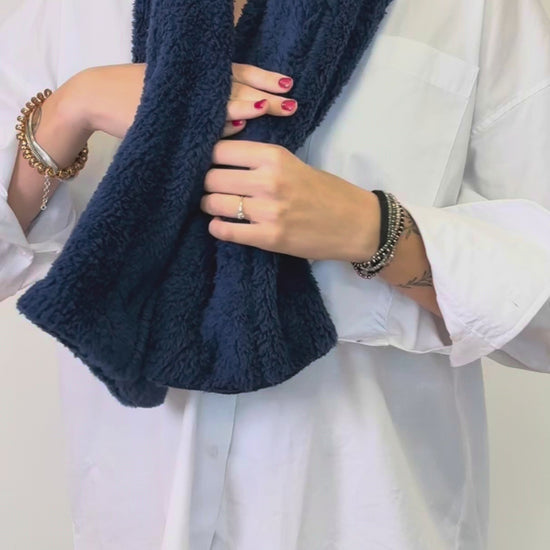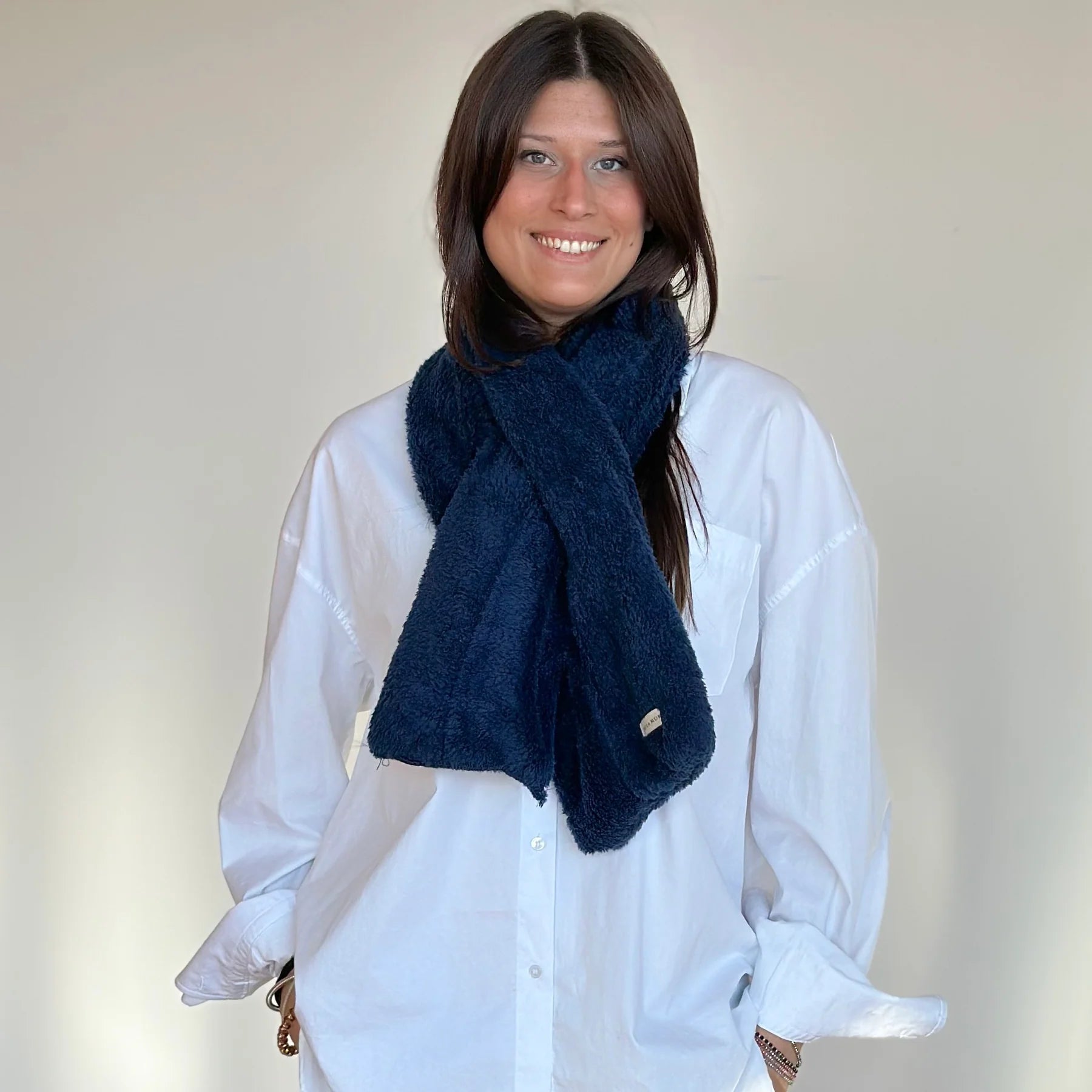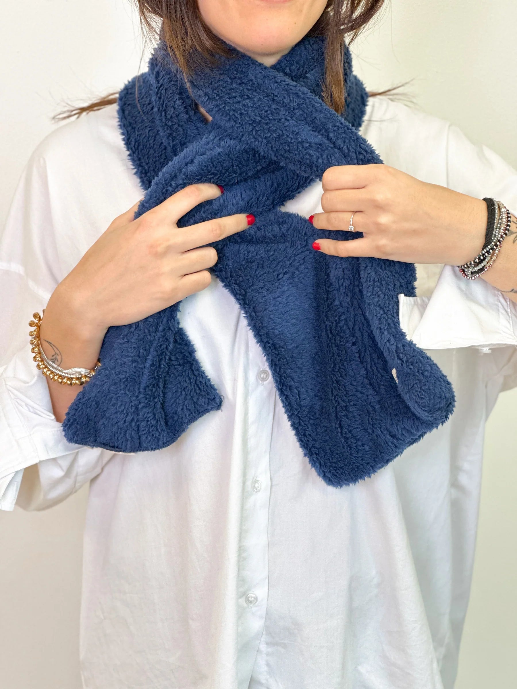 Deze doorsteeksjaal van de La Mur Line is uitgevoerd in een marineblauwe teddystof.