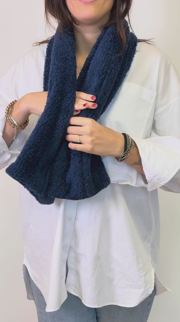 Dankzij het handige ontwerp steek je het uiteinde eenvoudig door de opening waardoor de sjaal mooi op zijn plaats blijft zitten. Deze korte teddy sjaal is compact, zacht en warm - een elegante winteraccesoire die comfort en stijl perfect combineert.
