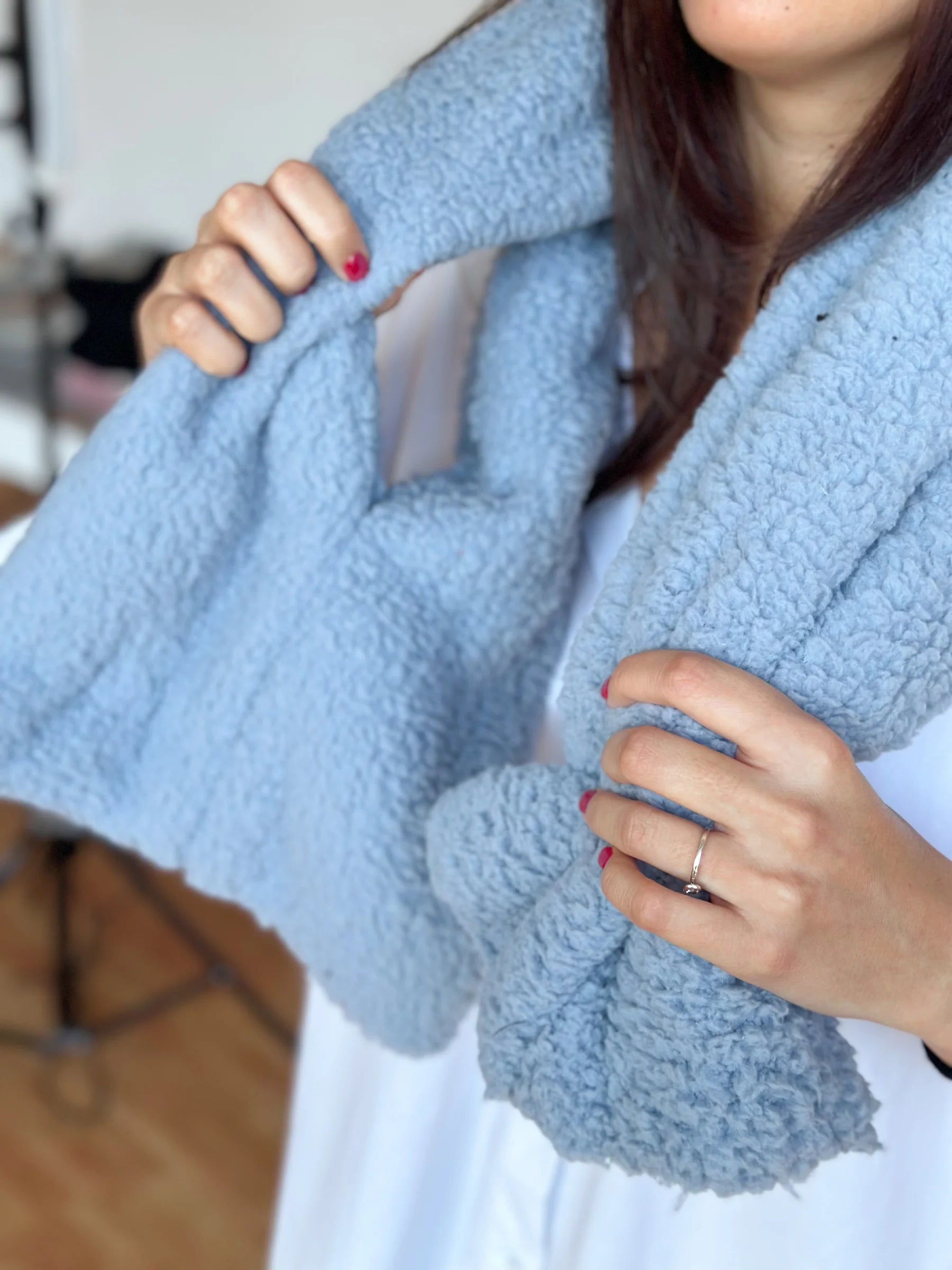 Deze doorsteeksjaal van de La Mur Line is uitgevoerd in een lichtblauwe teddystof.