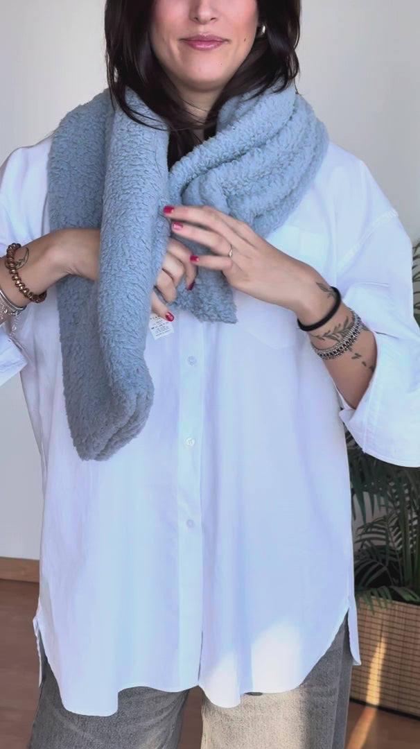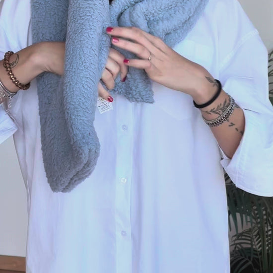 Dankzij het handige ontwerp steek je het uiteinde eenvoudig door de opening waardoor de sjaal mooi op zijn plaats blijft zitten. Deze korte teddy sjaal is compact, zacht en warm - een elegante winteraccesoire die comfort en stijl perfect combineert.