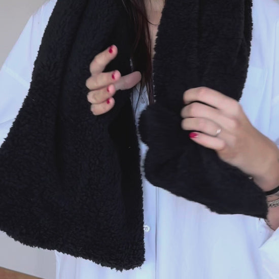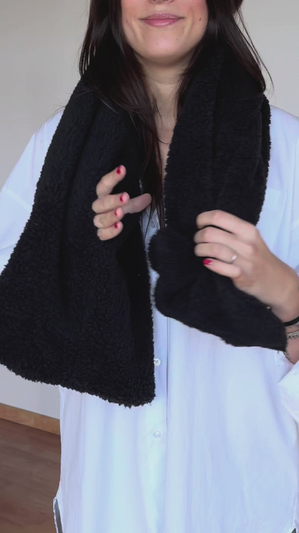 Dankzij het handige ontwerp steek je het uiteinde eenvoudig door de opening waardoor de sjaal mooi op zijn plaats blijft zitten. Deze korte teddy sjaal is compact, zacht en warm - een elegante winteraccesoire die comfort en stijl perfect combineert.