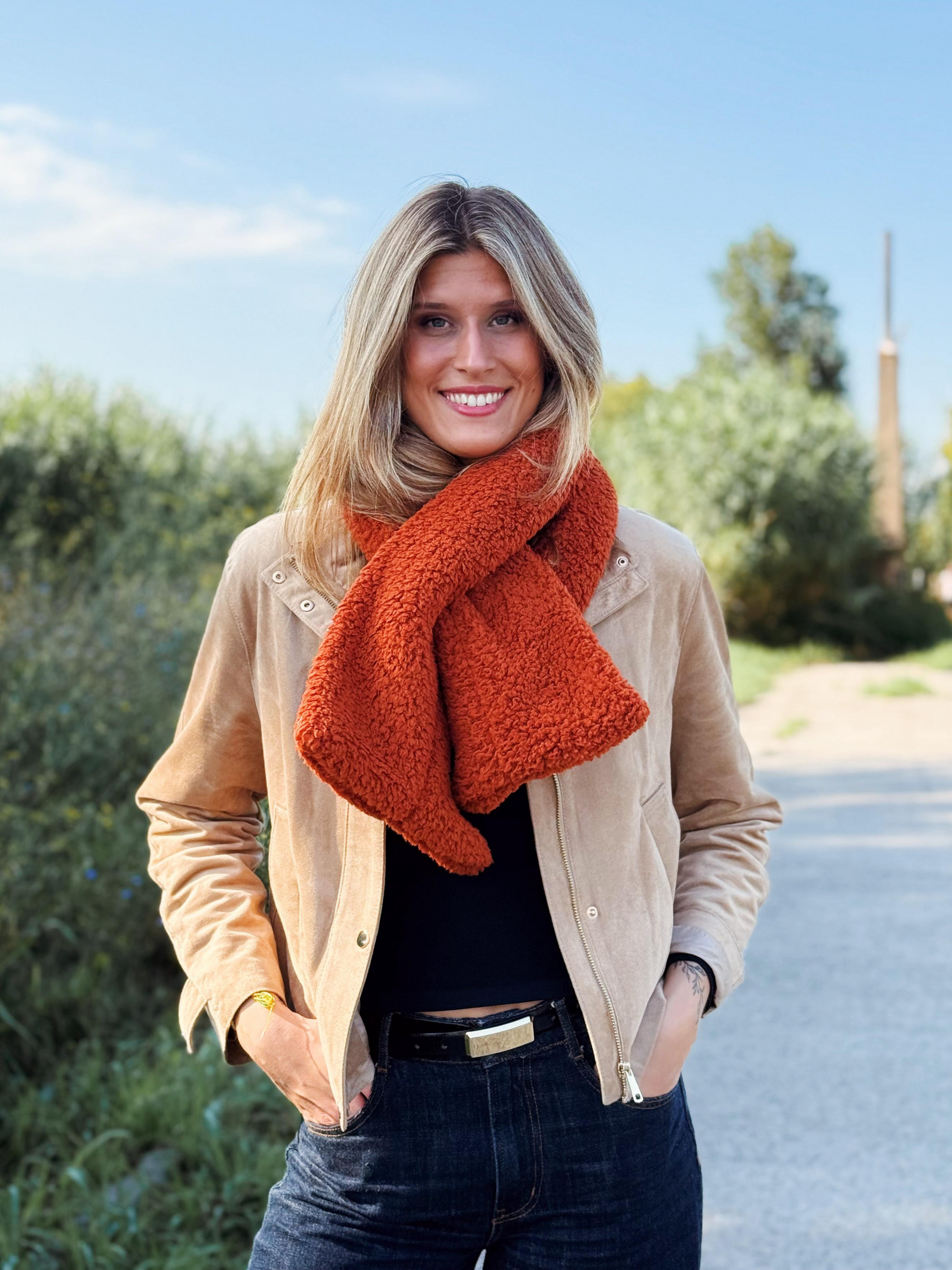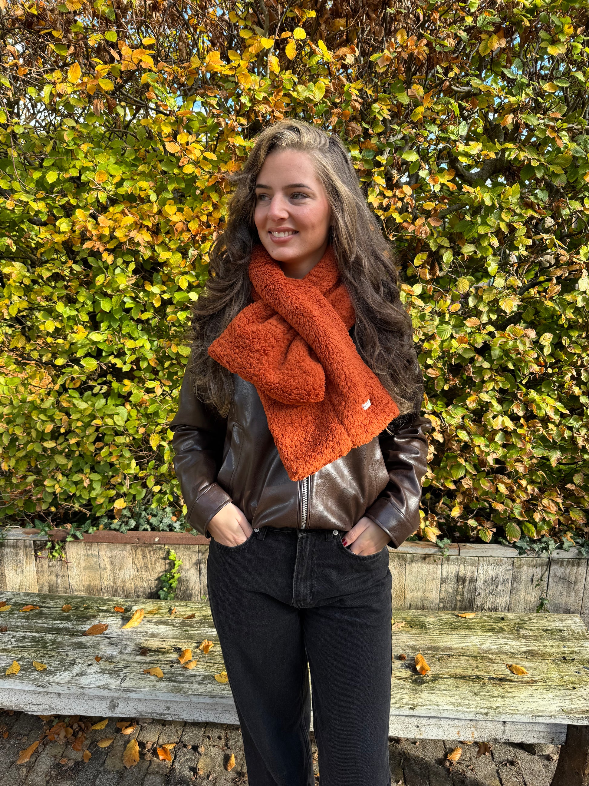 Deze doorsteeksjaal van de La Mur Line is uitgevoerd in een terracottakleurige teddystof.
