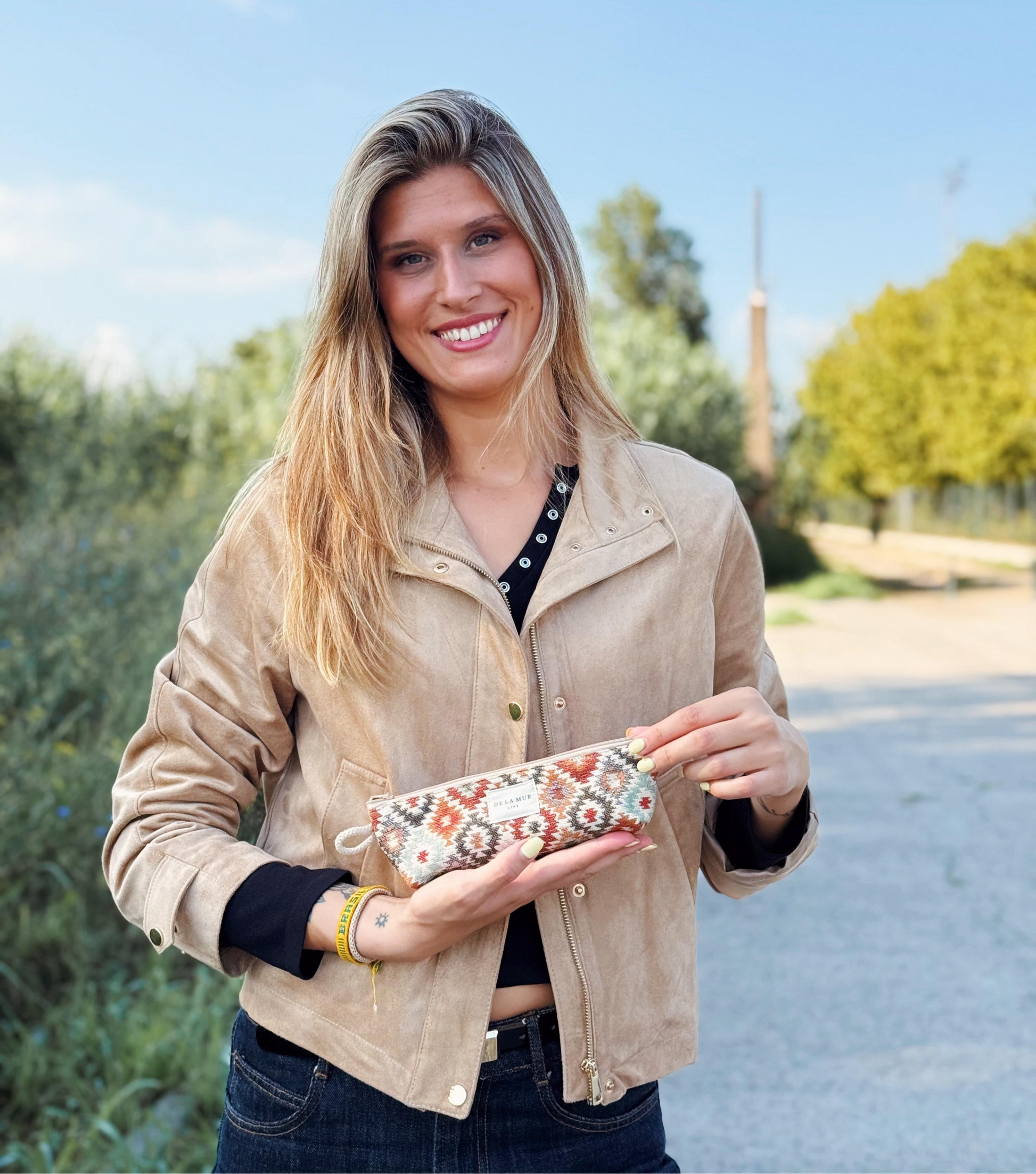 Deze elegante etui is uitgevoerd in een stevige jacquardstof met een fijn patroon van kleine ruitjes in roestbruin, rood-oranje, olijfgroen, beige en lichtblauw. Het geweven effect geeft het design extra diepte. Elk item kan variëren in patroon, afhankelijk van hoe het is uitgesneden.