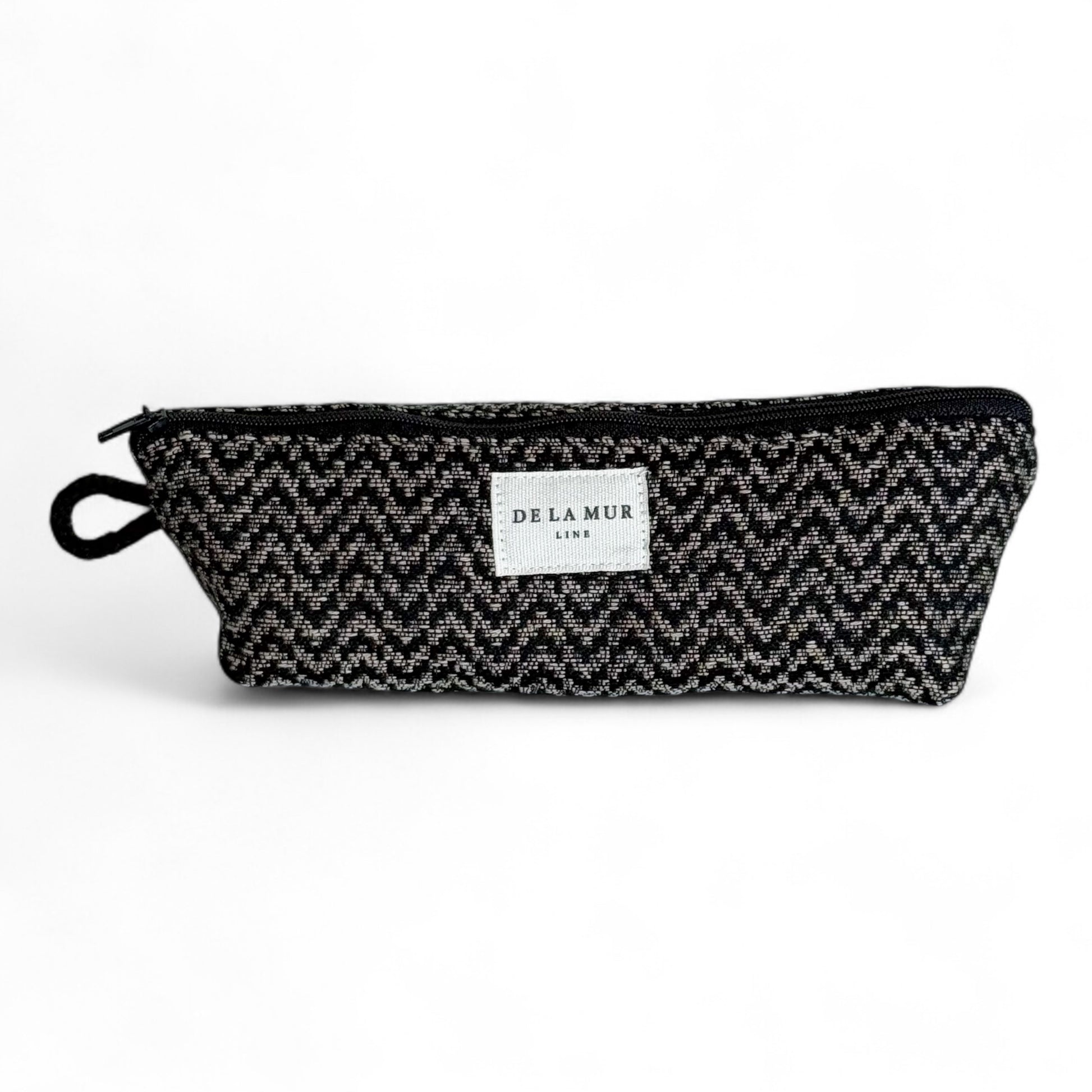 Deze elegante etui is uitgevoerd in een dikke jacquardstof met een zigzagpatroon in zwart en beige.