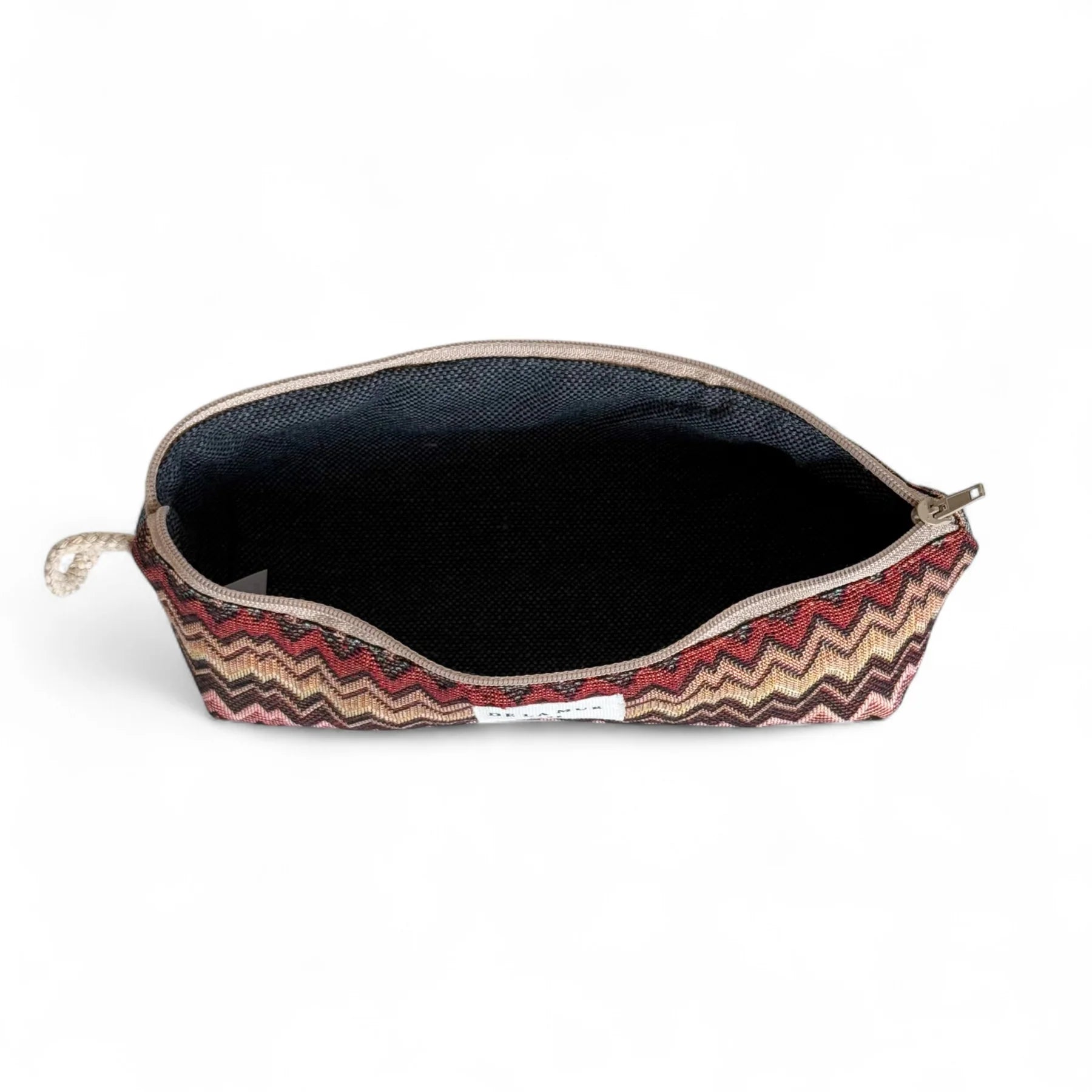 Deze elegante etui is uitgevoerd in een dikke jacquardstof met een kleurrijk zigzagpatroon in warme tinten zoals roest, oker, oudroze, blauw en bruin. Elk item kan variëren in patroon, afhankelijk van hoe het is uitgesneden.