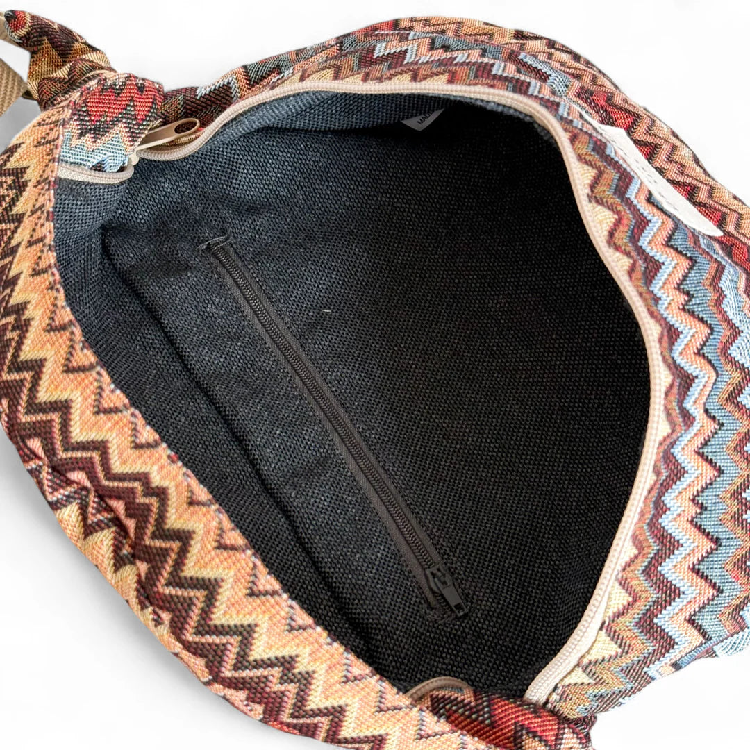 Dé musthave in je tassencollectie: de heuptas! Dit hippe heuptasje van de La Mur Line, ook wel fanny pack genoemd, is uitgevoerd in een dikke jacquardstof met een kleurrijk zigzagpatroon in warme tinten zoals roest, oker, oudroze, blauw en bruin.