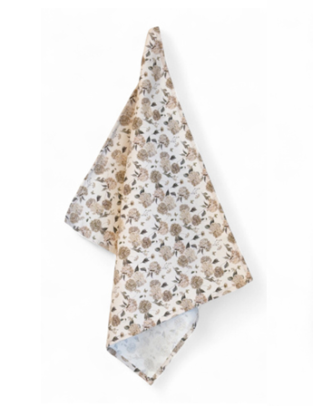 Deze keukendoek van De La Mur Line is gemaakt van een half-panama stof met een beige bloemenprint, gecombineerd met een beige Vichy-ruitjesprint op het voorvak.