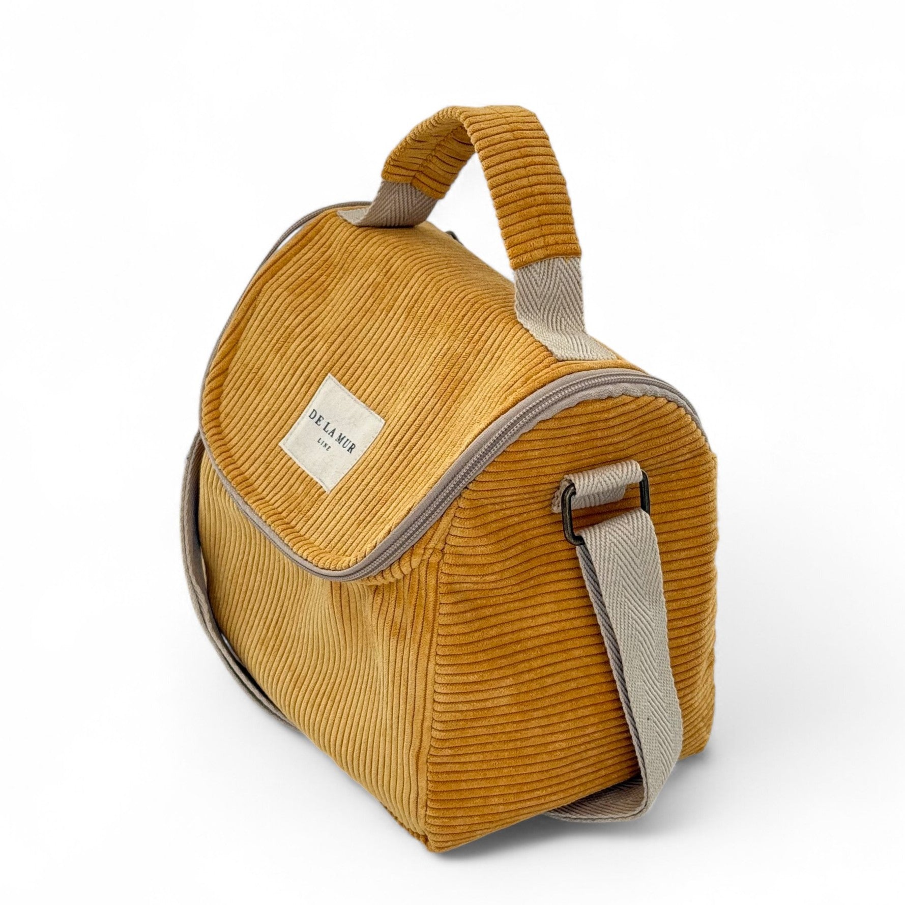 Deze stijlvolle lunchtas van De La Mur Line is uitgevoerd in een mosterdgele corduroy ribstof.