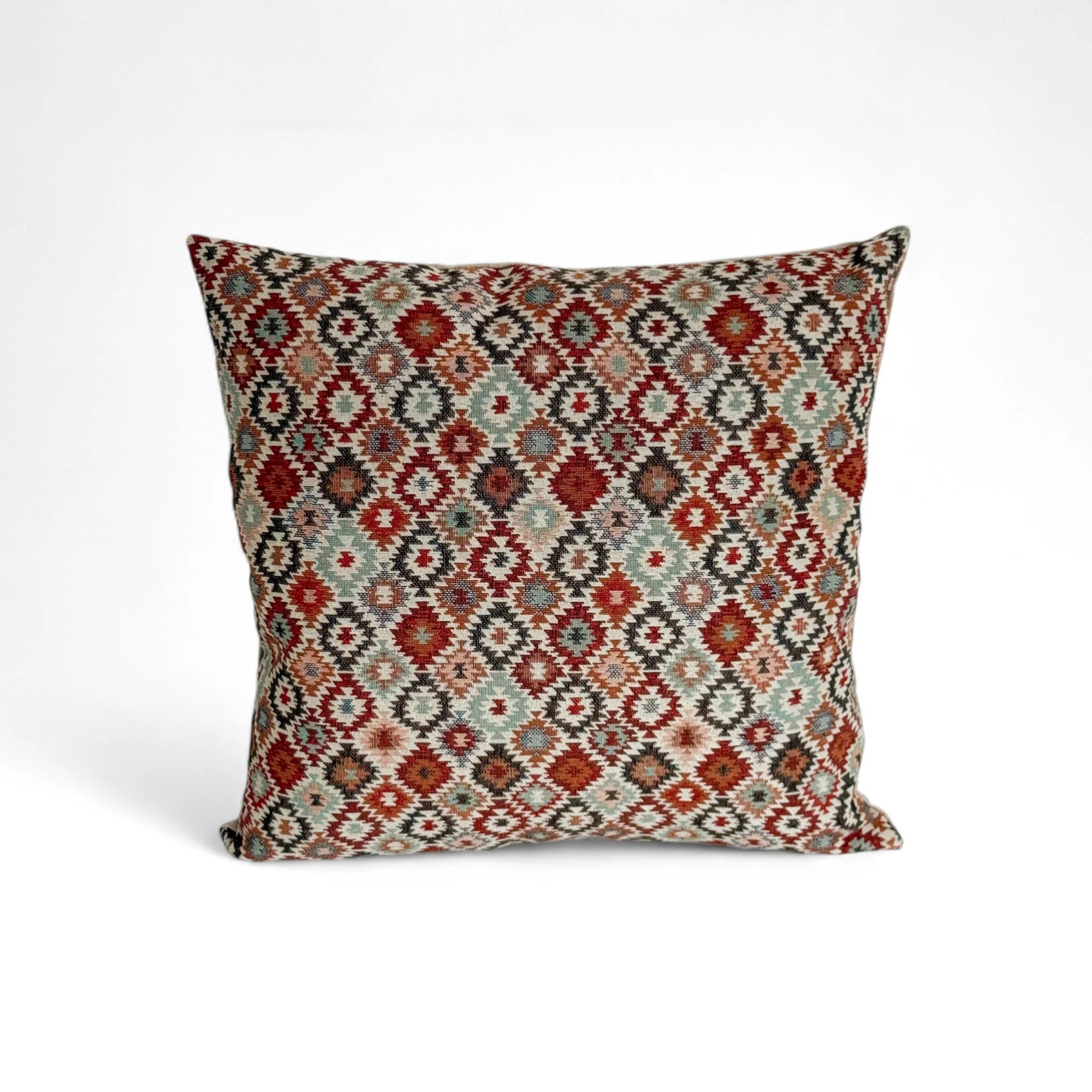 Deze sierkussenhoes van De La Mur Line is gemaakt van twee prachtige stoffen: aan de ene kant een jacquardstof met een fijn patroon van kleine ruitjes in roestbruin, rood-oranje, olijfgroen, beige en lichtblauw, en aan de andere kant een effen beige stof.
