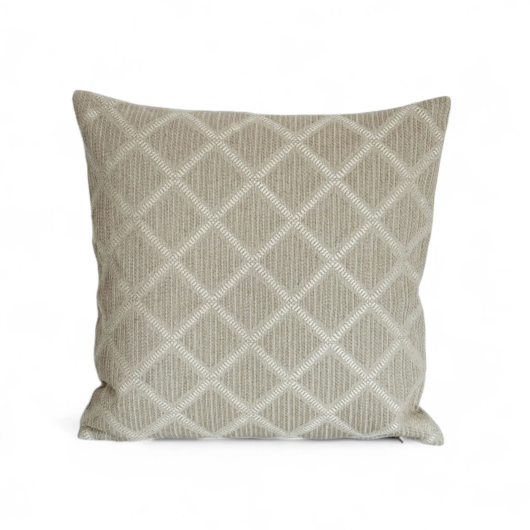 Deze sierkussenhoes van De La Mur Line is gemaakt van twee prachtige stoffen: aan de ene kant een jacquardstof met een geometrische print in crème- en beigetinten, en aan de andere kant een effen beige stof.