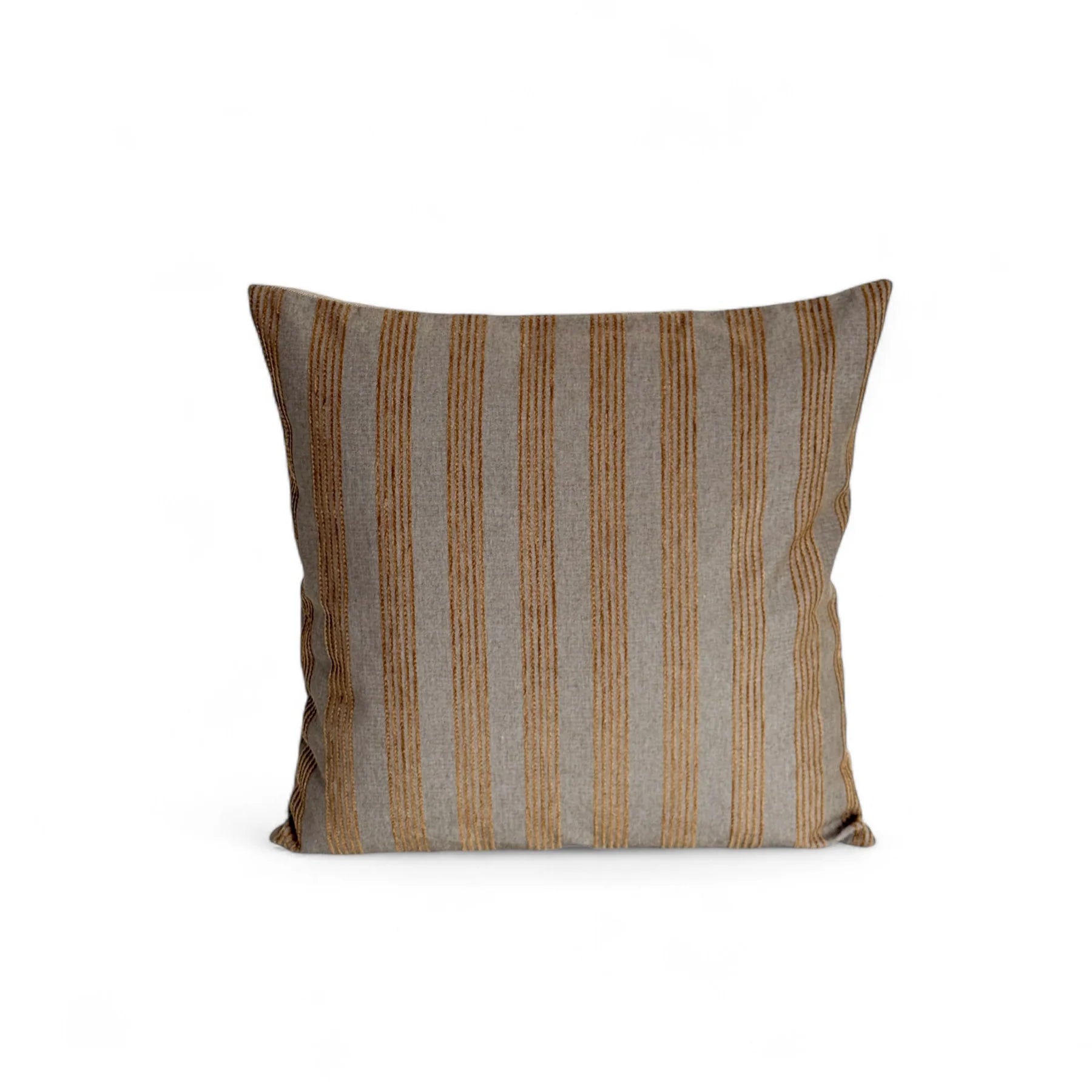 Deze sierkussenhoes van De La Mur Line is gemaakt van twee prachtige stoffen: aan de ene kant een chenille stof met een jute-achtige structuur en koperkleurige strepen, en aan de andere kant een effen beige stof.