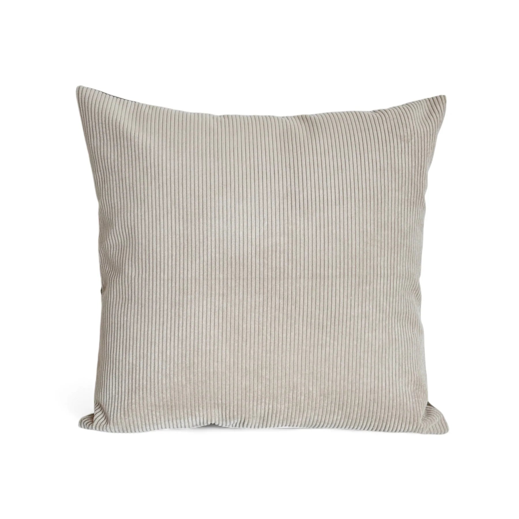 Deze sierkussenhoes van De La Mur Line is gemaakt van twee prachtige stoffen: aan de ene kant een beige corduroy ribstof, en aan de andere kant een effen jutte-achtige stof.