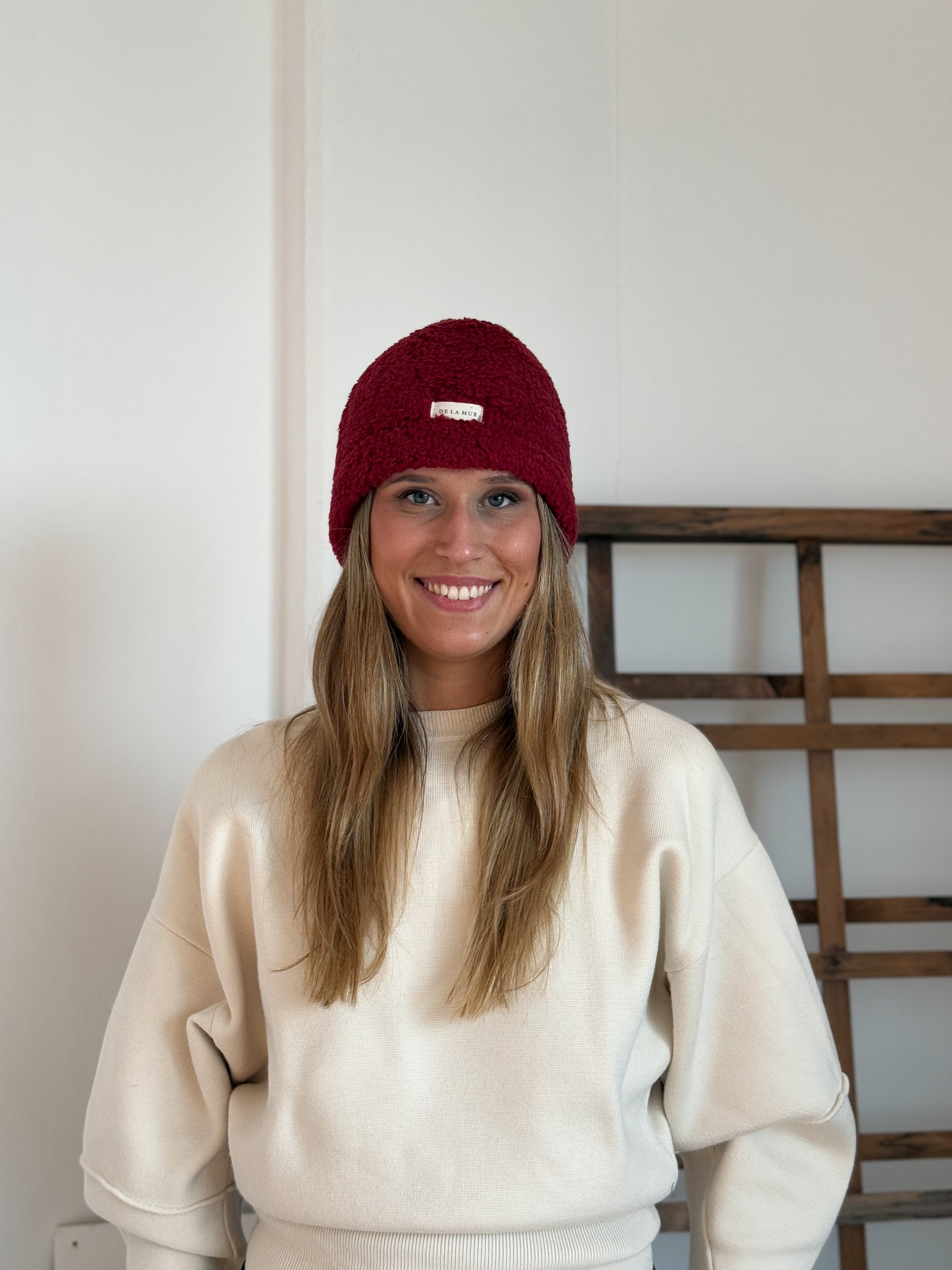 Deze muts van de La Mur Line is uitgevoerd in een bordeauxrode teddystof.