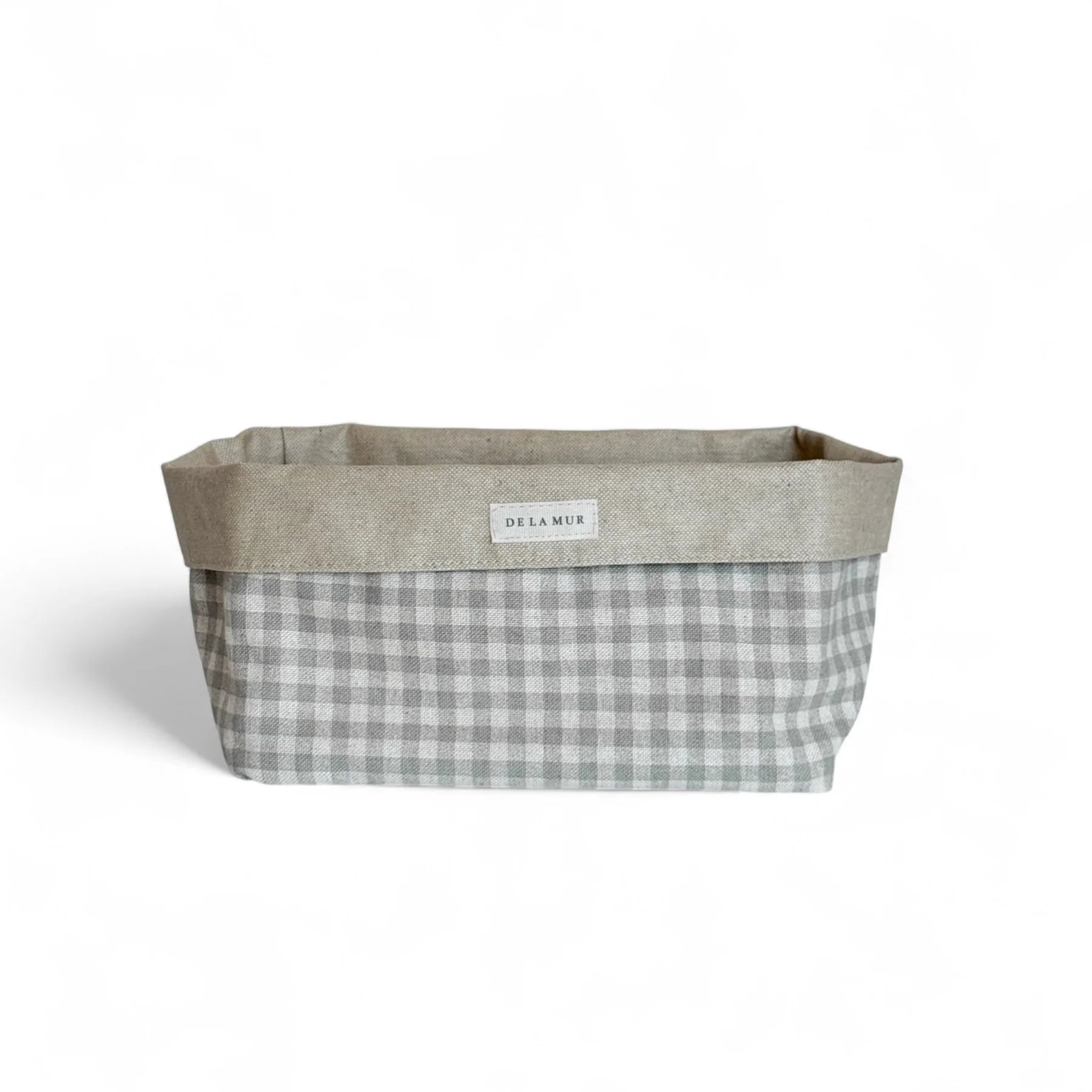 Dit opbergmandje van De La Mur Line is gemaakt van een half-panama stof met een pastelgroene Vichy-ruitjesprint. De binnenkant is afgewerkt met een gecoate laag die gemakkelijk schoon te maken is.