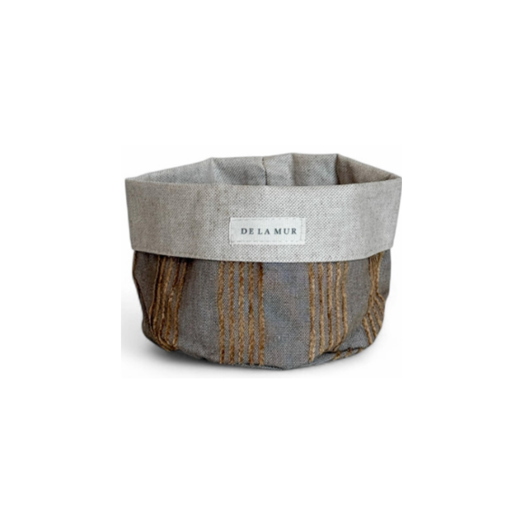 Dit opbergmandje van De La Mur Line is gemaakt van een chenille stof met een jute-achtige structuur en koperkleurige strepen. De binnenkant is afgewerkt met een gecoate laag die gemakkelijk schoon te maken is.