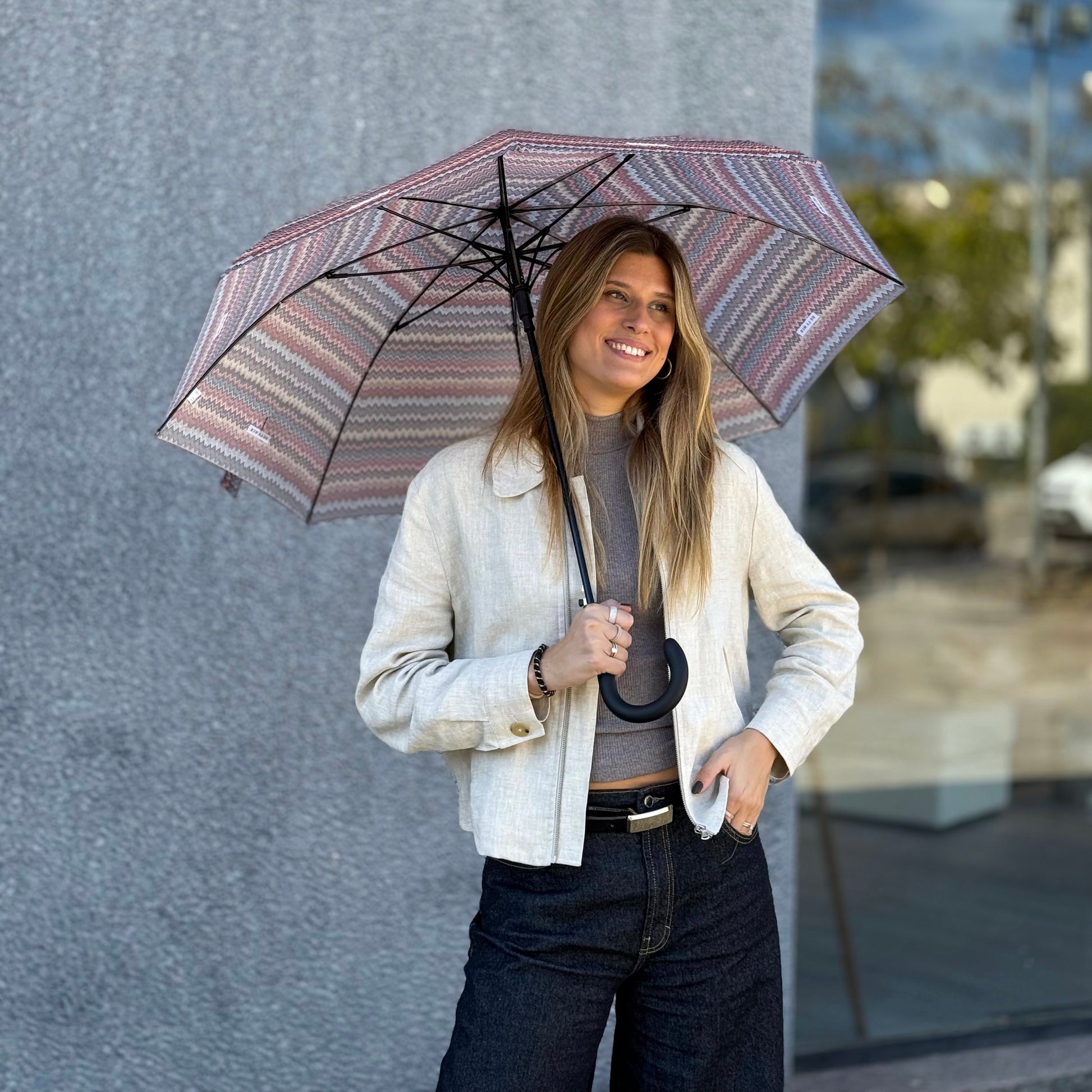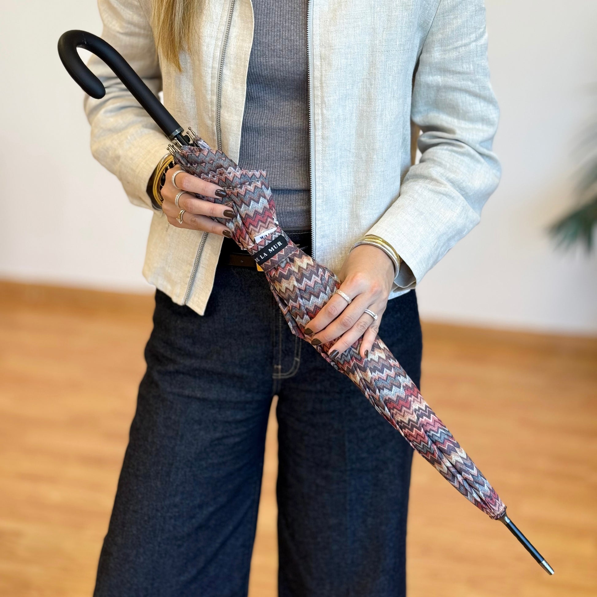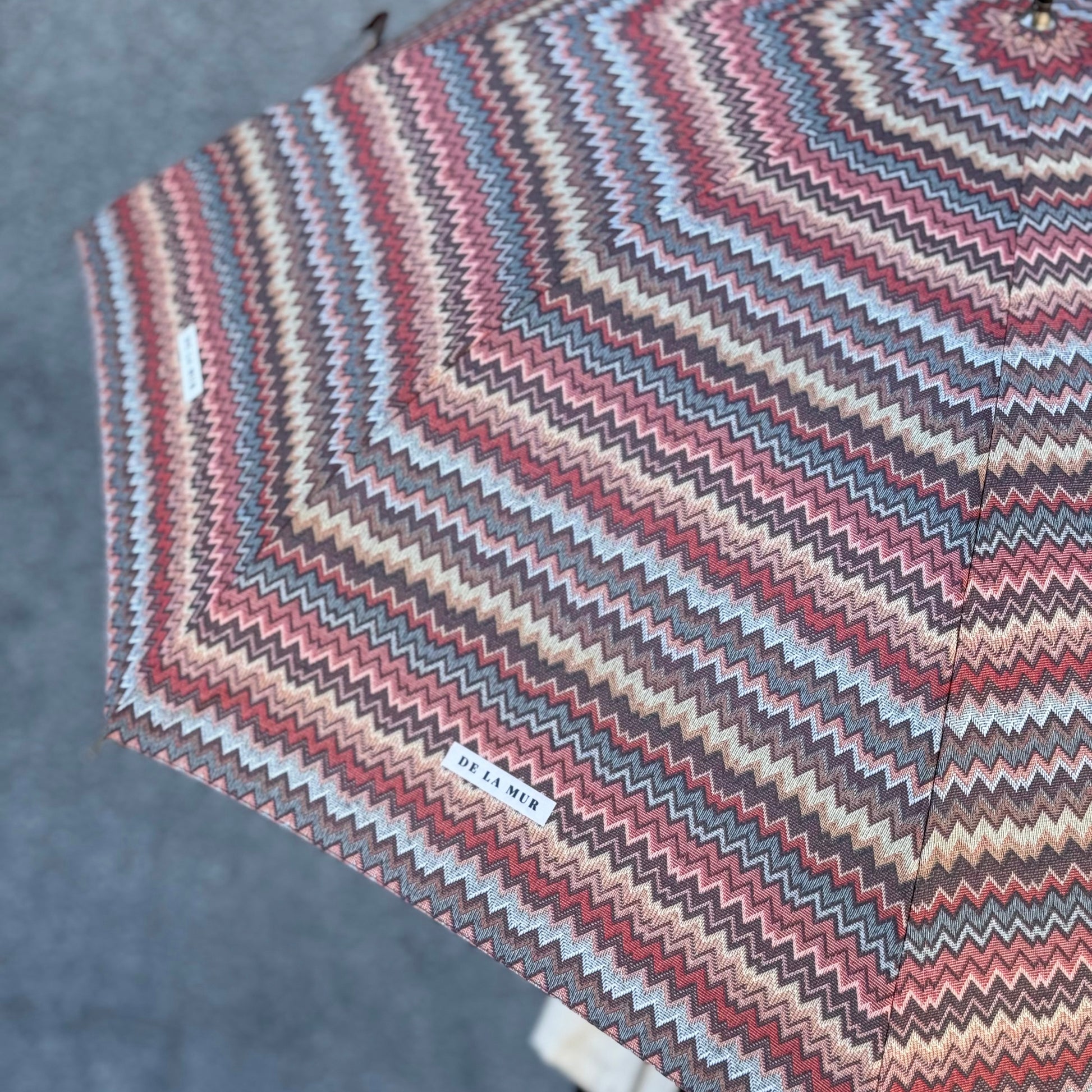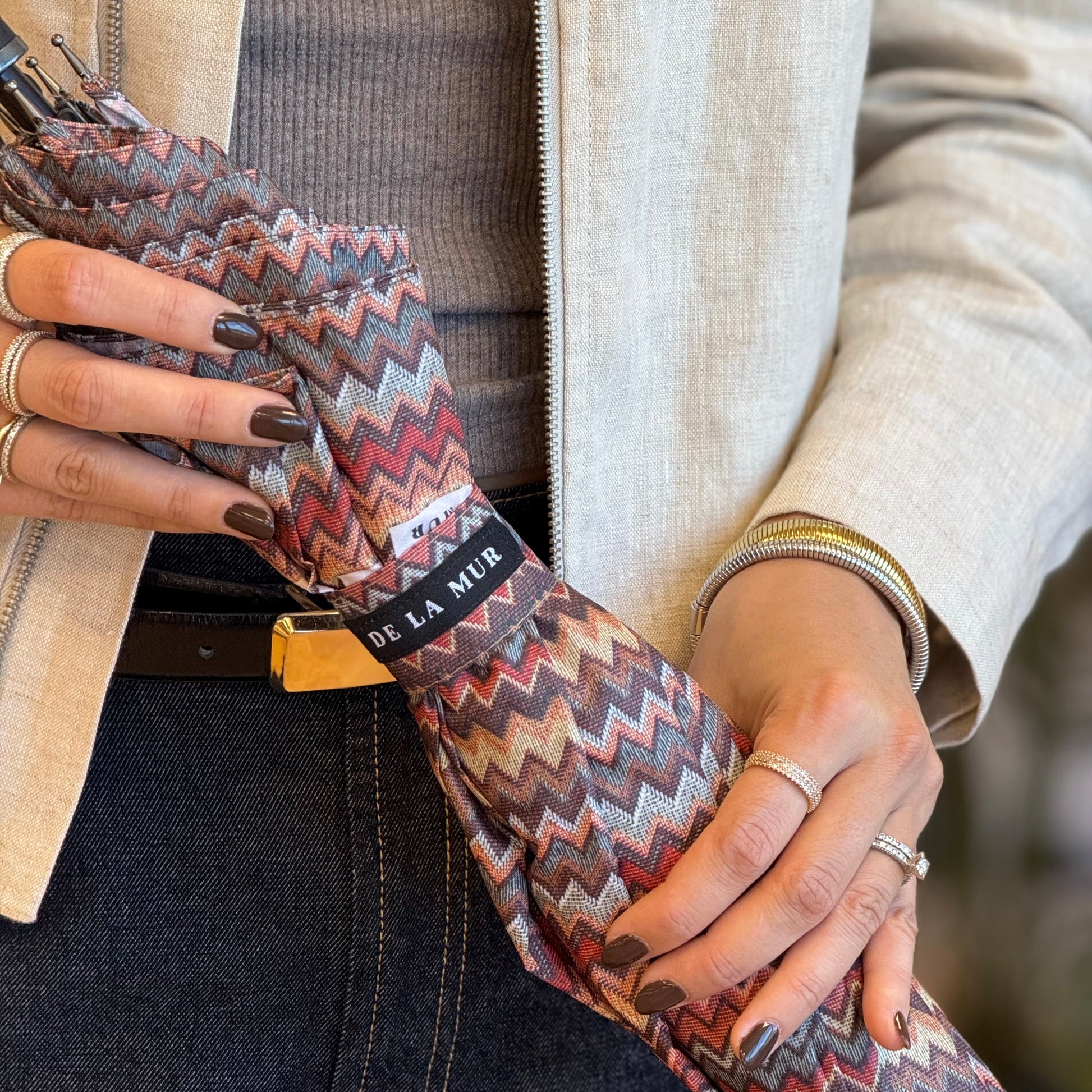 Deze elegante paraplu van De La Mur Line is uitgevoerd in een kleurrijk zigzagpatroon in warme tinten zoals roest, oker, oudroze, blauw en bruin. Ontworpen in dezelfde print als onze tassen en accessoires, zodat je altijd perfect gestyled de deur uitgaat, ook als het regent.