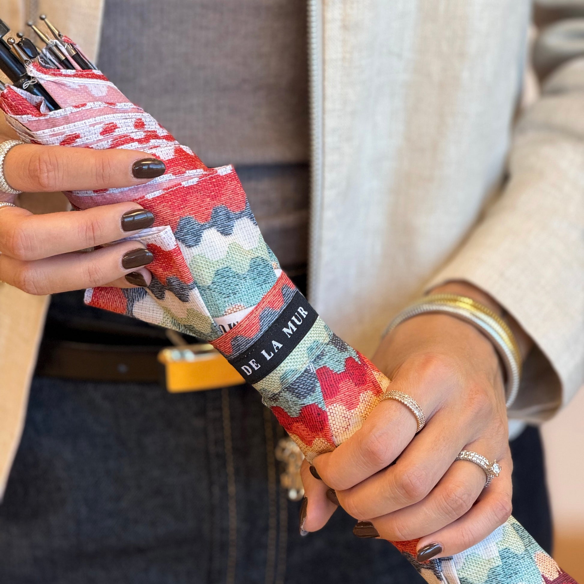 Combineer deze stijlvolle paraplu met onze bijpassende tassen en accessoires.