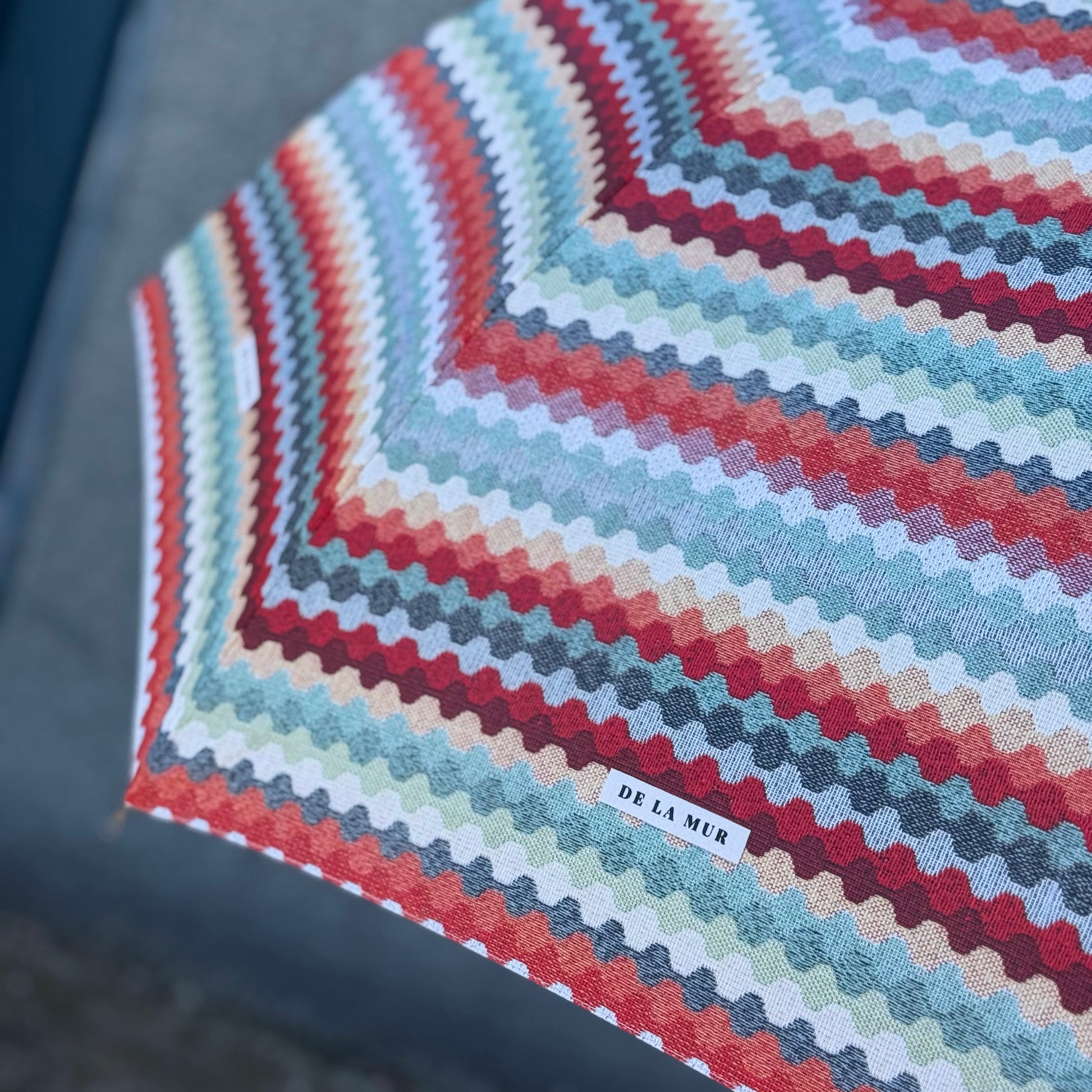 Deze elegante paraplu van De La Mur Line is uitgevoerd in een ritmisch, golvend patoon in kleurrijke banen. Ontworpen in dezelfde print als onze tassen en accessoires, zodat je altijd perfect gestyled de deur uitgaat, ook als het regent.