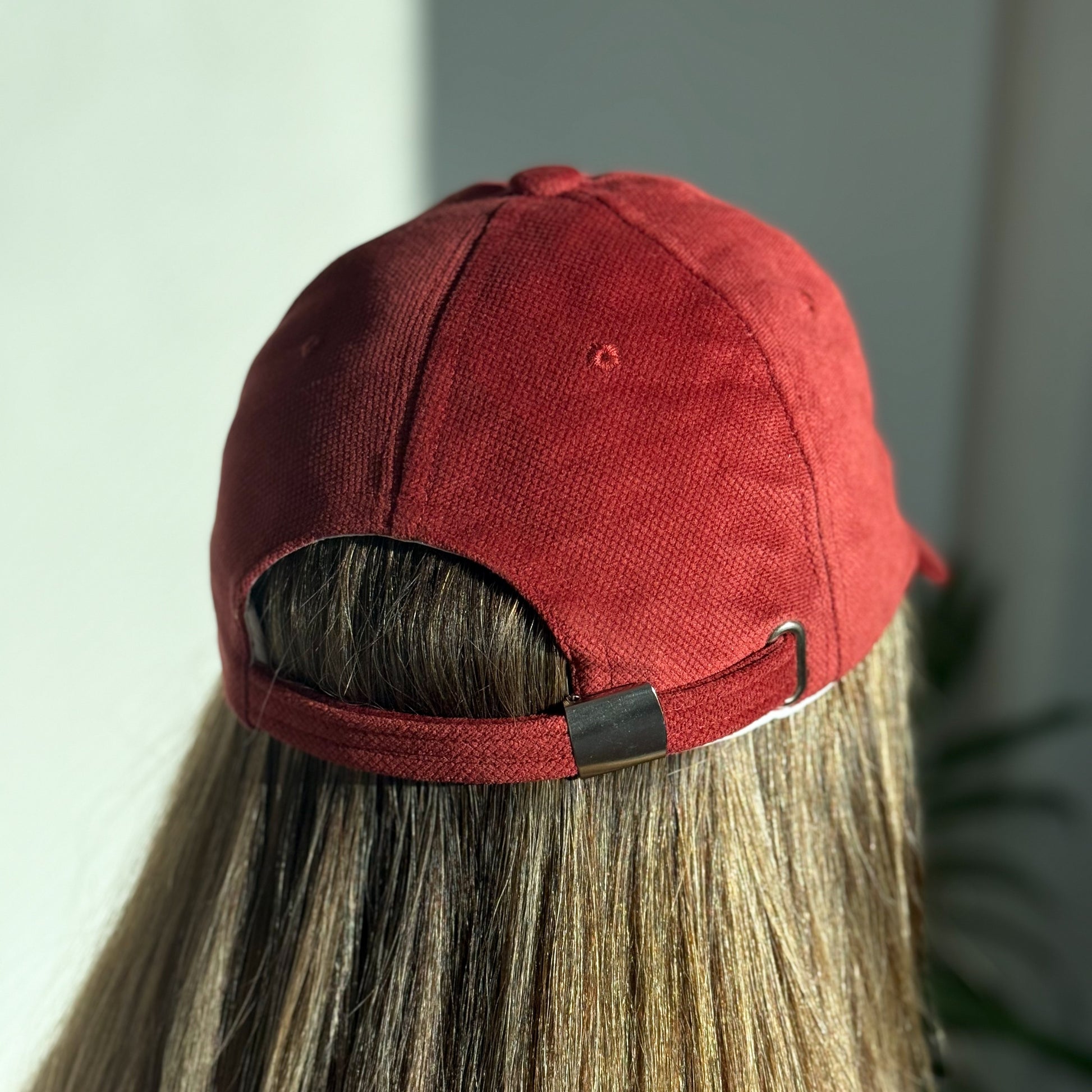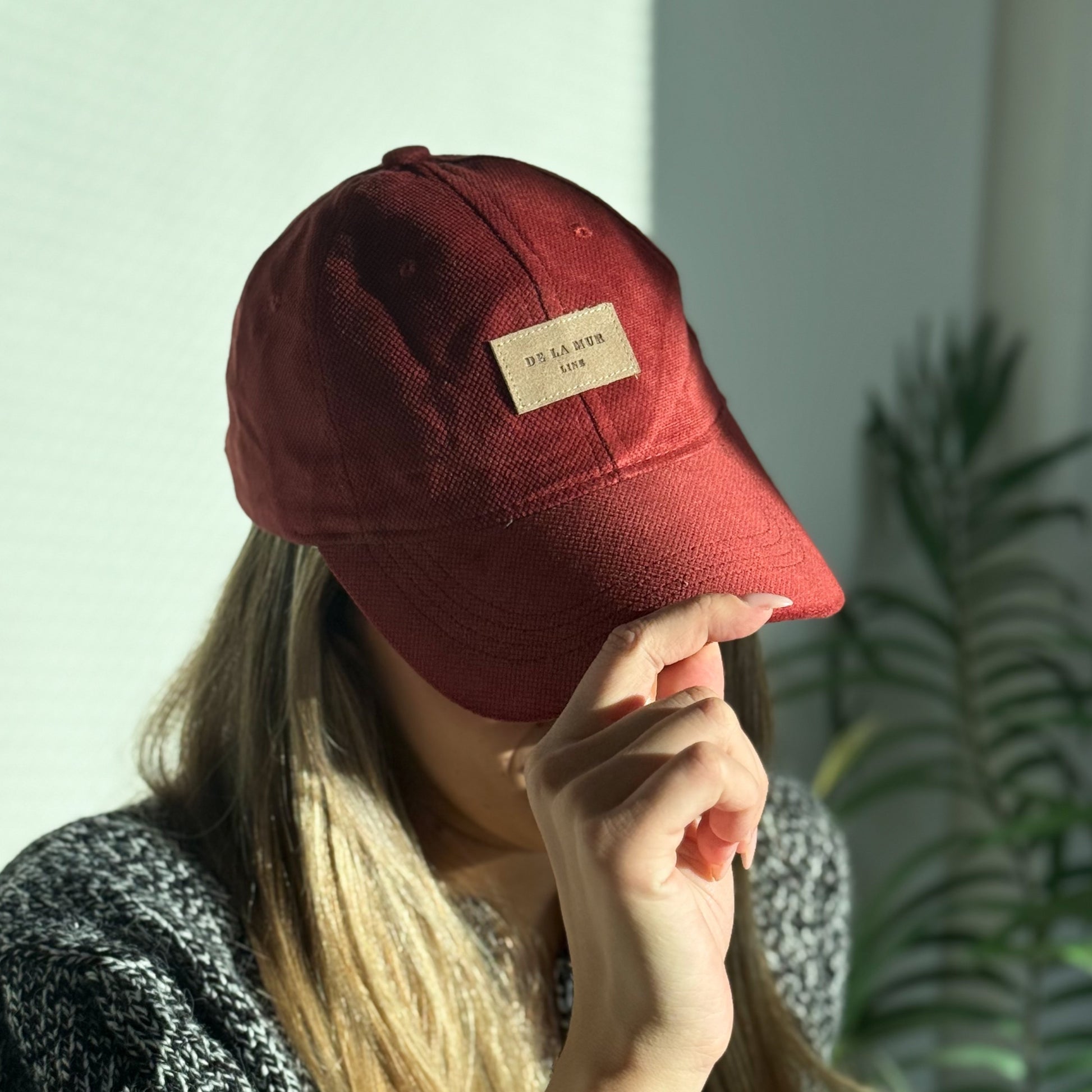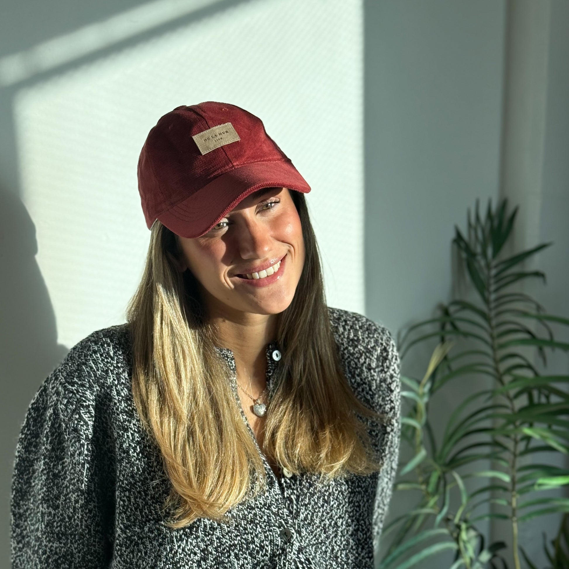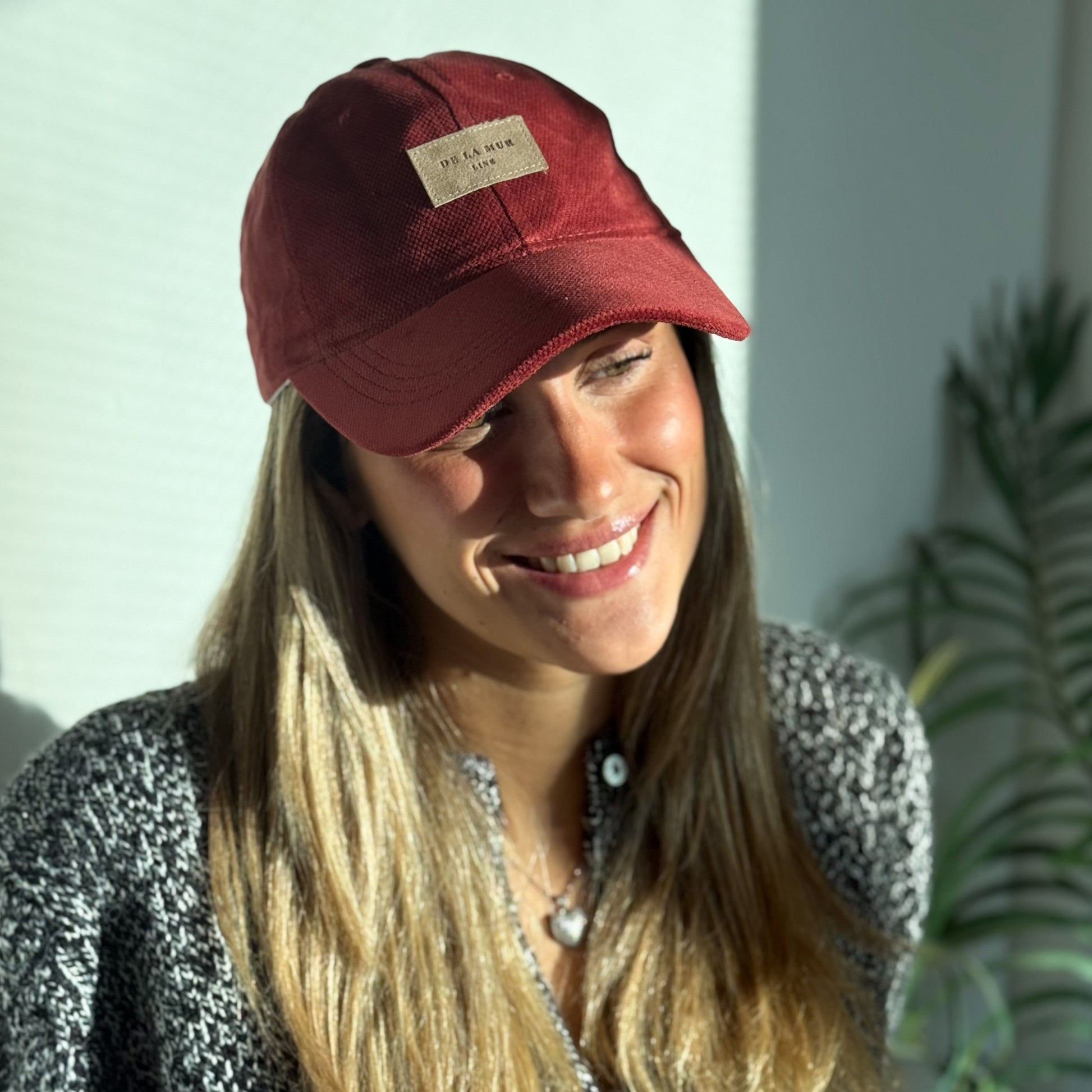 Deze karaktervolle pet van De La Mur Line is uitgevoerd in een bordeauxrode velvet stof met een beigekleurig label.