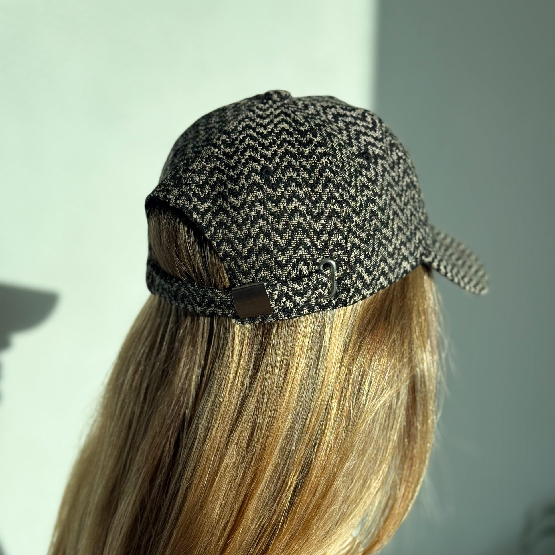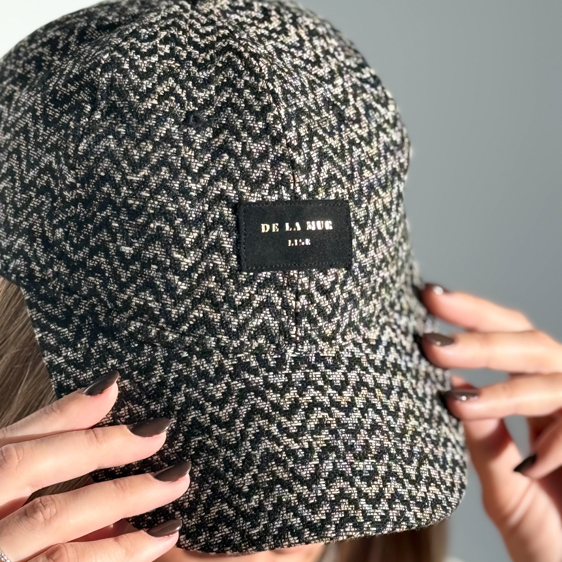 Deze karaktervolle pet van De La Mur Line is uitgevoerd in een zwart-beige zigzagpatroon.