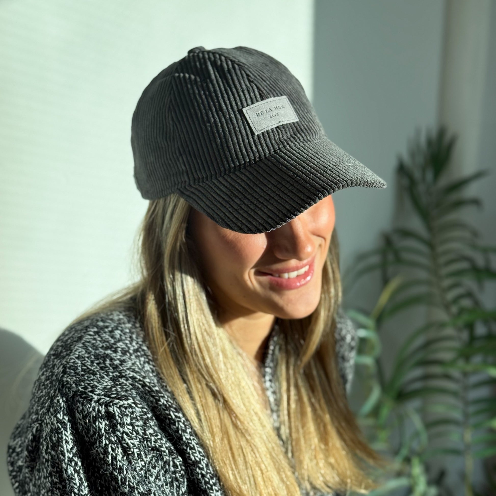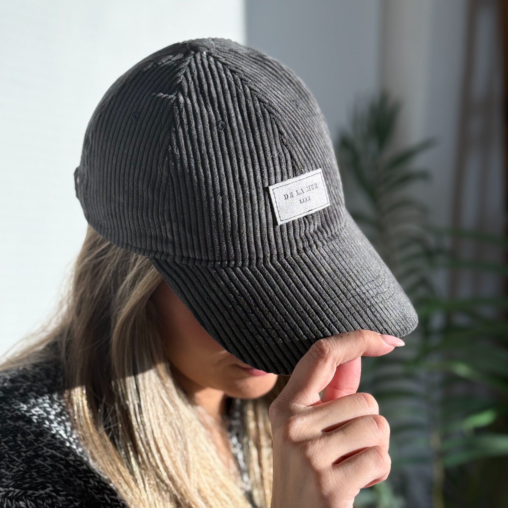Deze karaktervolle pet van De La Mur Line is uitgevoerd in donkergrijze/antraciete corduroy ribstof met een grijs label.