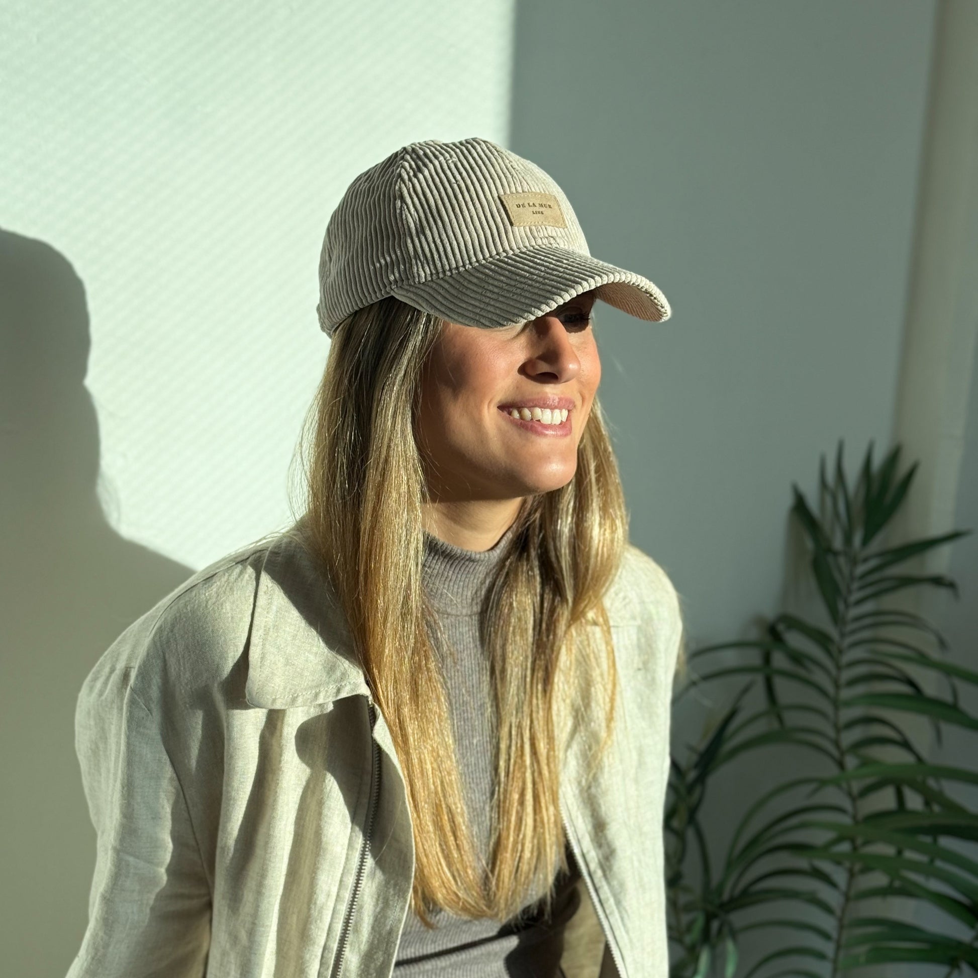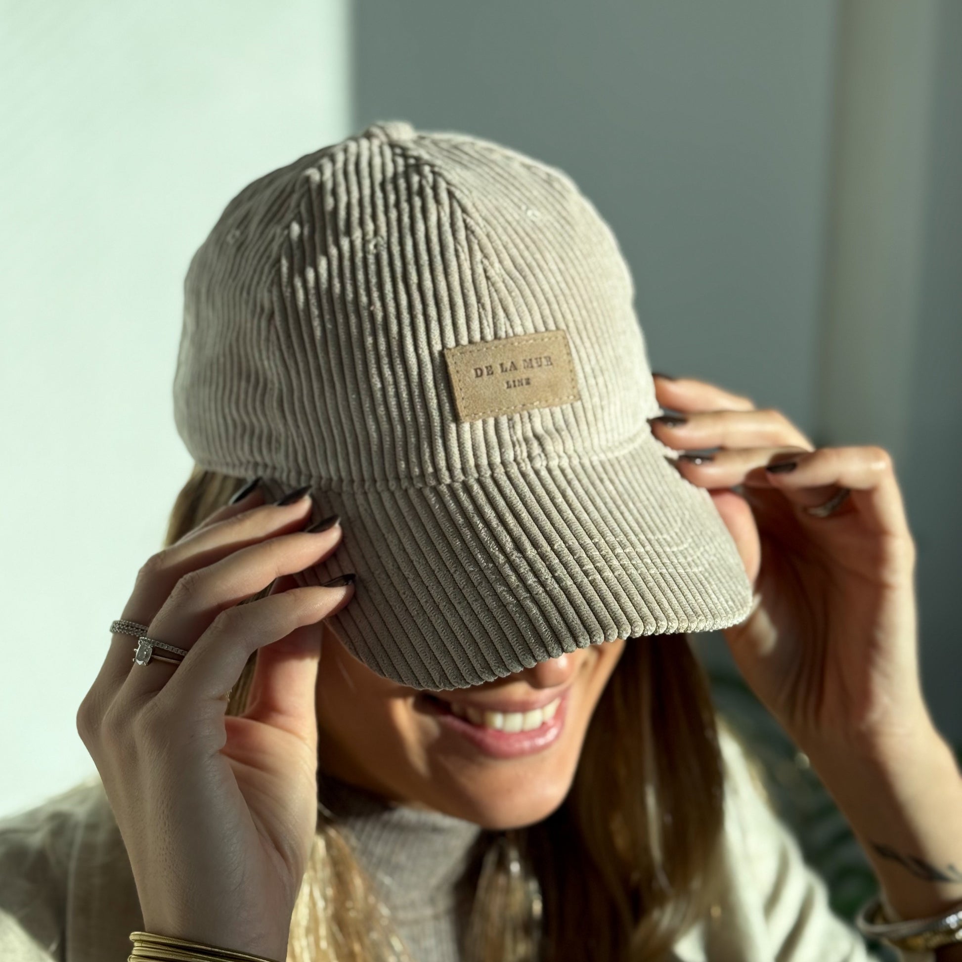 Deze karaktervolle pet van De La Mur Line is uitgevoerd in beige corduroy ribstof met een camelkleurig label.