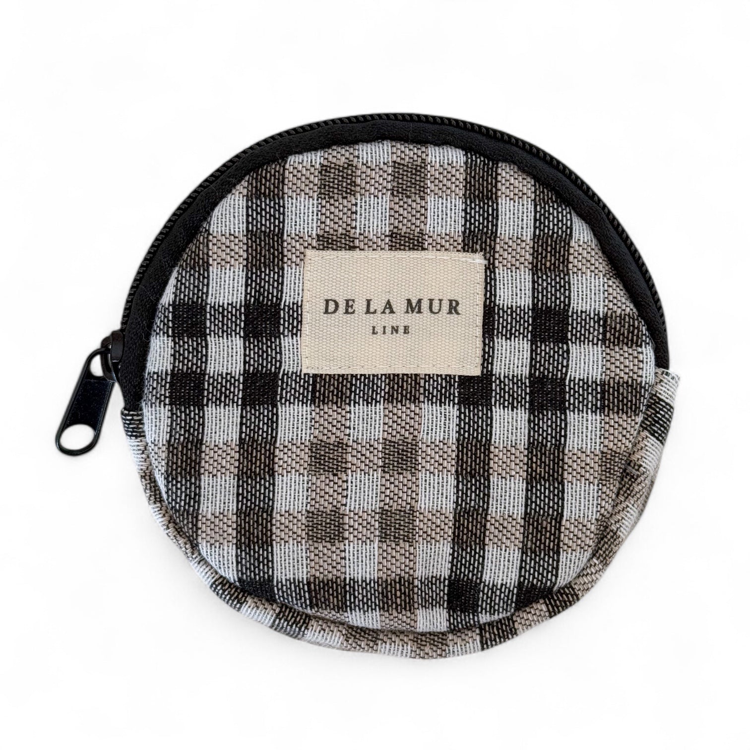 Dit speelse, ronde portemonneetje van de La Mur Line is uitgevoerd in een dikke jacquardstof met een ruitjespatroon in beige en zwarttinten. Elk item kan variëren in patroon, afhankelijk van hoe het is uitgesneden.